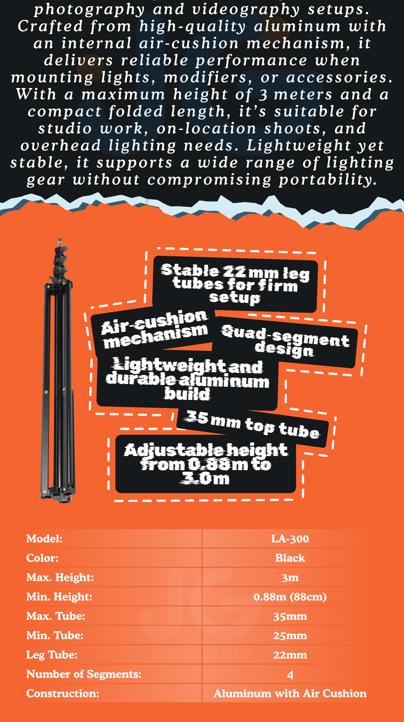 The Godox LA-300 Air Cushion/Aluminum Black Light Stand is perfect for professional photographers who need to have reliable and sturdy lighting equipment. Whether you're shooting in a studio or on location, this light stand allows you to easily adjust the height of your lighting equipment and secure it in place, providing you with greater flexibility and creative control.
