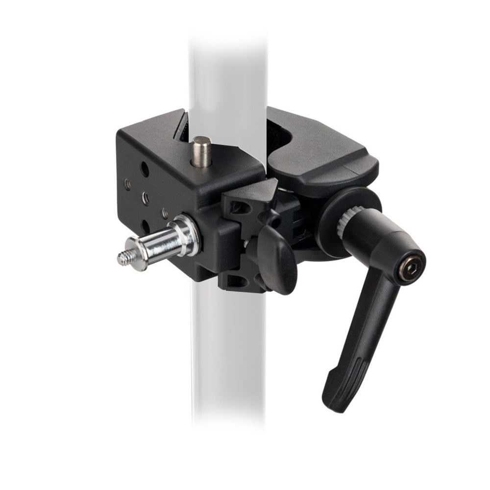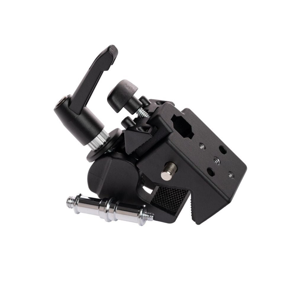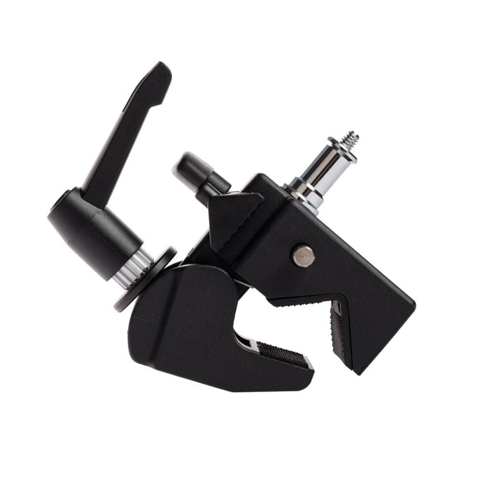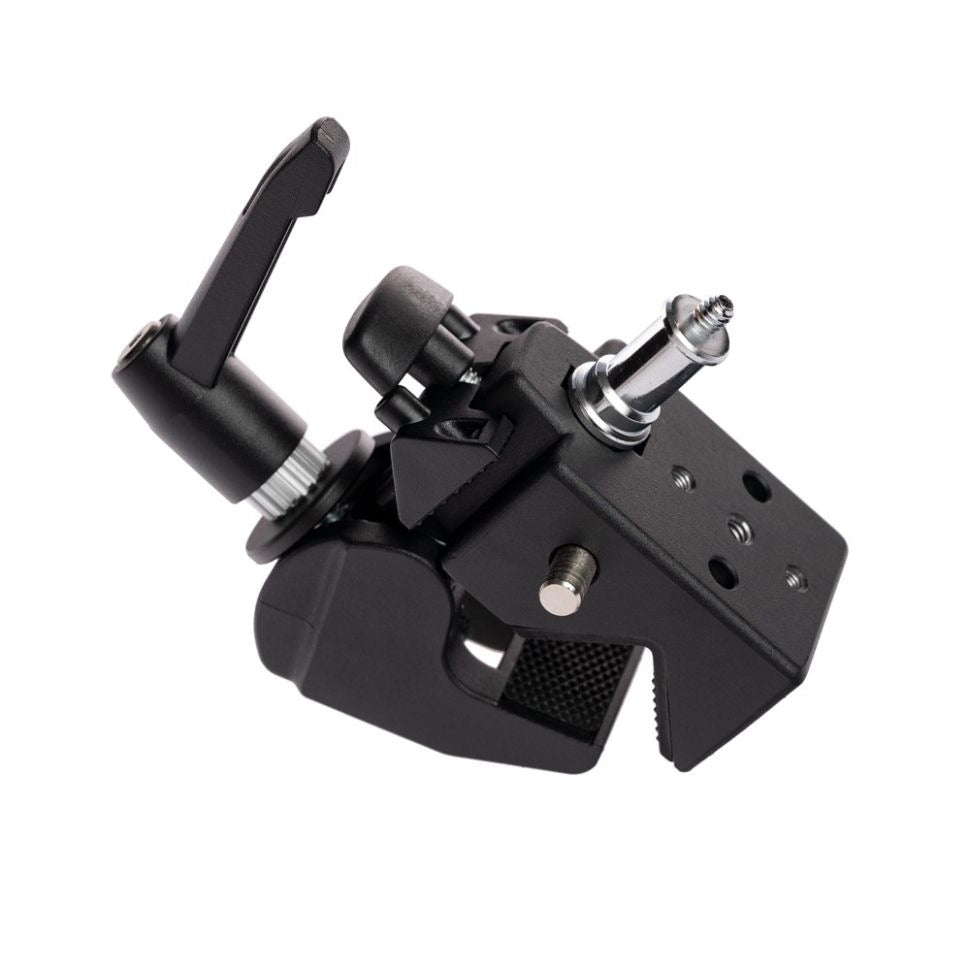 This Godox LSA-03 Nano Clamp can be used to hold lighting accessories such as lightweight reflectors, flags, or gobos. It features a receiver for a 5/8" stud and ratchet handle to help ensure a tight grip with its rounded-jaw design.