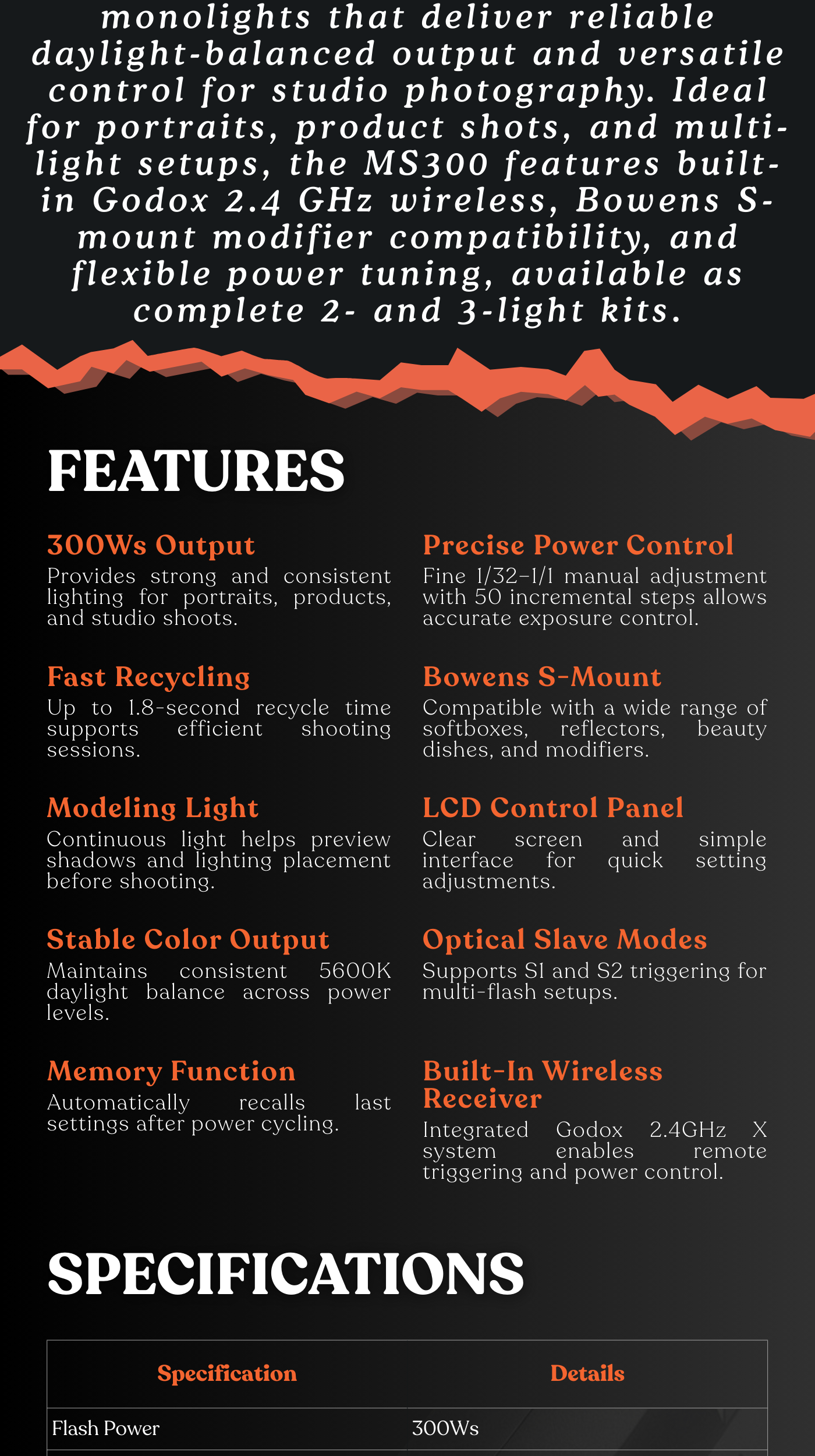 The MS Series Studio Flashes are lightweight, compact, and durable flashes with comprehensive functions. Designed for studio photography, portrait, and still life photography, the studio flash can be used as a background light or fill light source.