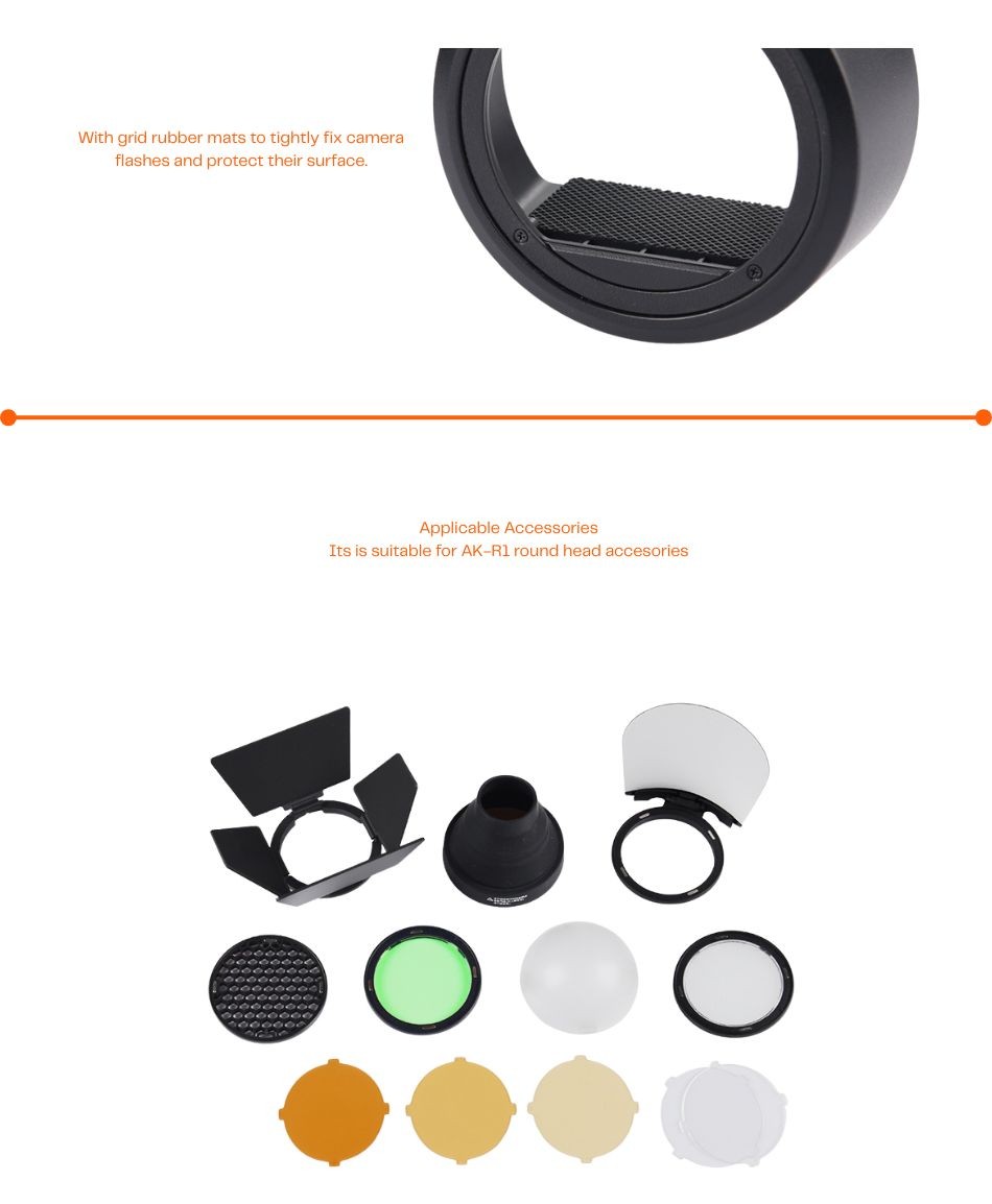 The optional AK-R1 kit features a number of modifiers and accessories, including a dome diffuser, four-way barndoors, a diffuser plate, a bounce card, honeycomb grid, color filters, and a snoot.
