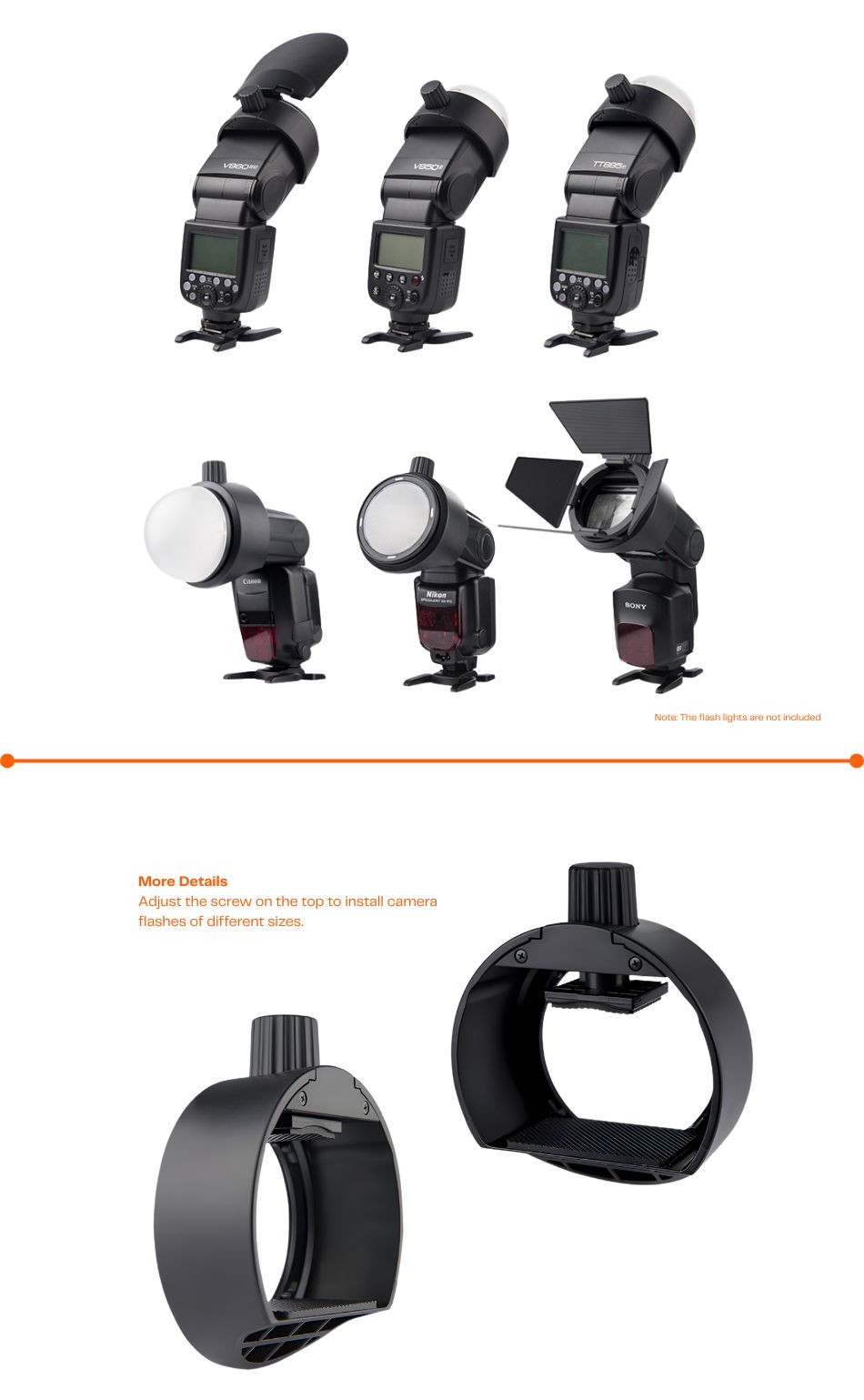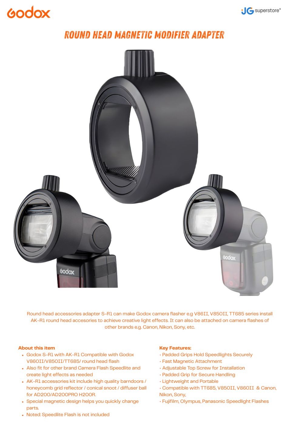 • Suitable For: Standard hot-shoe speedlights (Godox TT685, V850II, V860II and other compatible with & Canon, Nikon, Sony, Fujifilm, Olympus, Panasonic Speedlight Flashes brands) using round-head magnetic modifiers.
