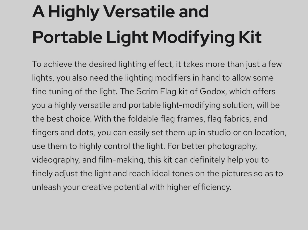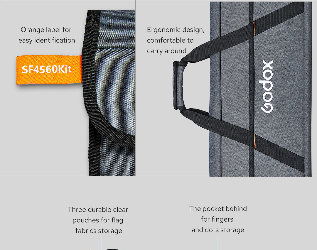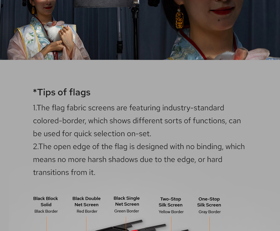 The kit contains 5 flag frames and fabric screens to assemble for shaping, blocking, or diffusing the light, as well as 2 fingers and 2 dots to allow more precise adjustments of light on small objects.