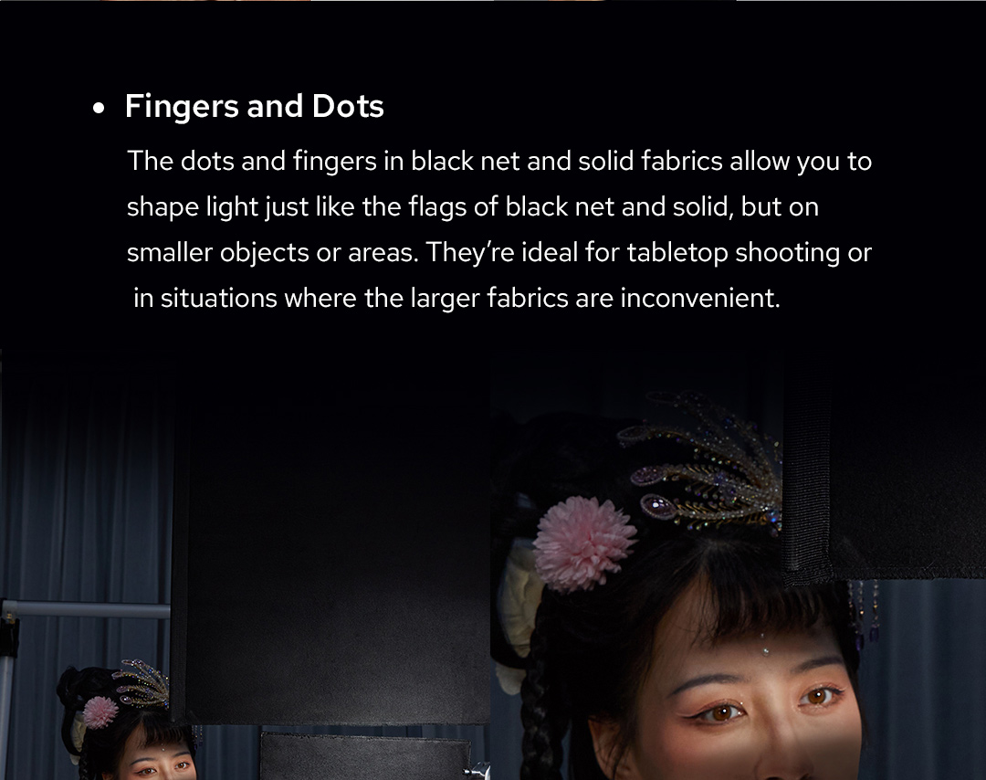 The dots and fingers in black net and solid fabrics allow you to shape light, just like the larger flag and screens, but on a smaller scale for work such as tabletop imaging.
