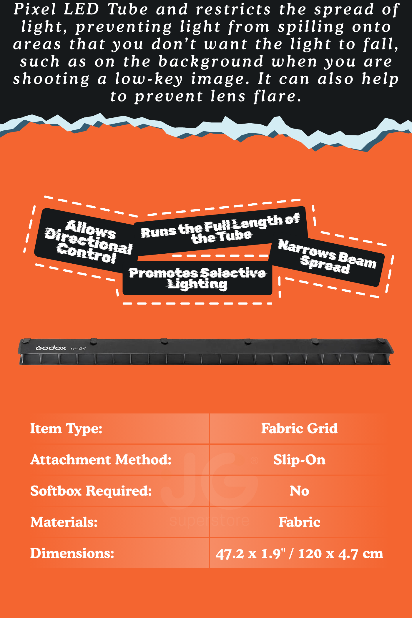 Running the entire length of your TP4R LED tube light, the TP-G4 Grid from Godox narrows the tube's beam spread, limits spill light, and provides directional control to enable selective lighting.