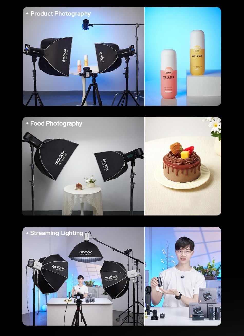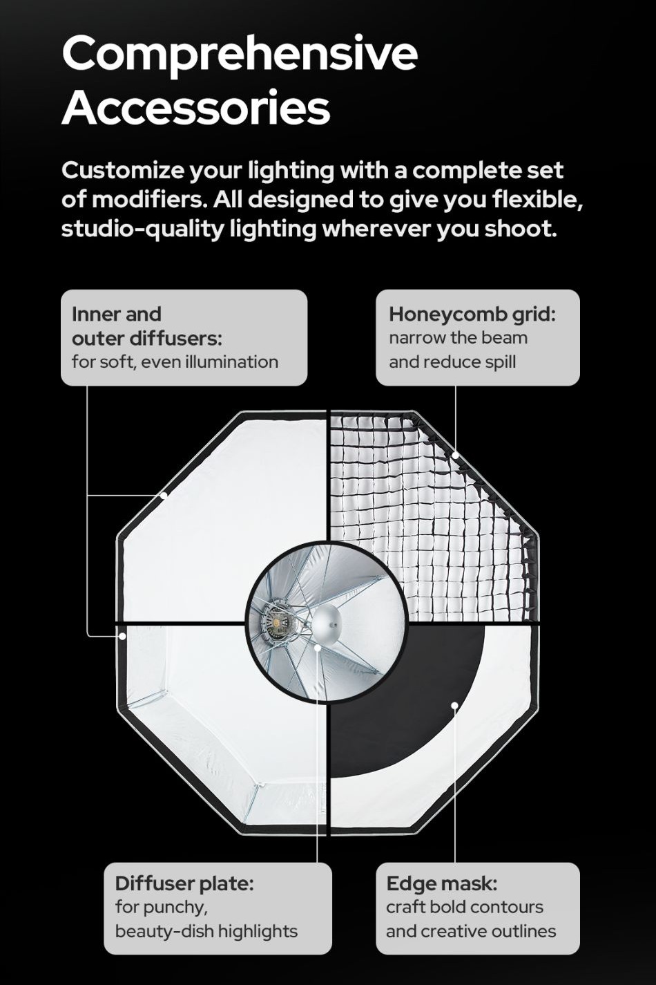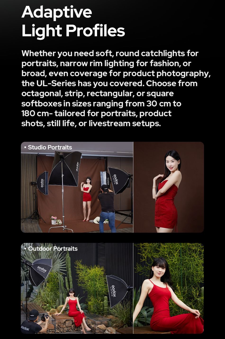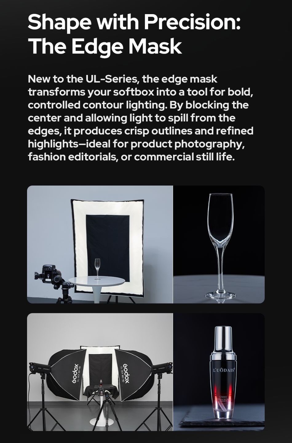 Godox also offers an optional edge mask that blocks the center of the softbox for a more controlled contour light. The light spills from the softbox edges, producing crisp and refined highlights. The optional edge mask is ideal for product photography, fashion editorials, and commercial still life work.