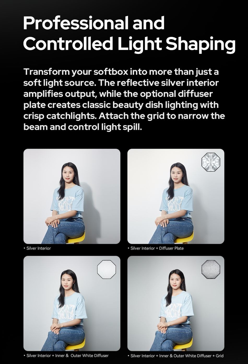 This softbox features a deflector plate that transforms into a beauty dish-style modifier if needed. This allows you to achieve a similar punchy effect to a beauty dish rather than a softbox. It also comes with a white inner baffle and an outer diffuser for soft, even illumination.
