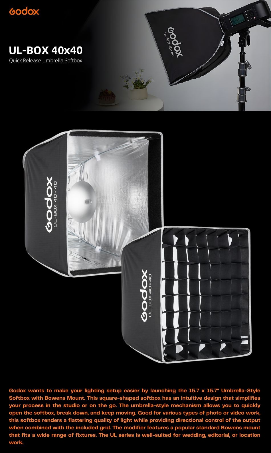 Godox wants to make your lighting setup easier by launching the 15.7 x 15.7" Umbrella-Style Softbox with Bowens Mount. This square-shaped softbox has an intuitive design that simplifies your process in the studio or on the go. The umbrella-style mechanism allows you to quickly open the softbox, break down, and keep moving. Good for various types of photo or video work, this softbox renders a flattering quality of light while providing directional control of the output when combined with the included grid. The modifier features a popular standard Bowens mount that fits a wide range of fixtures. The UL series is well-suited for wedding, editorial, or location work.