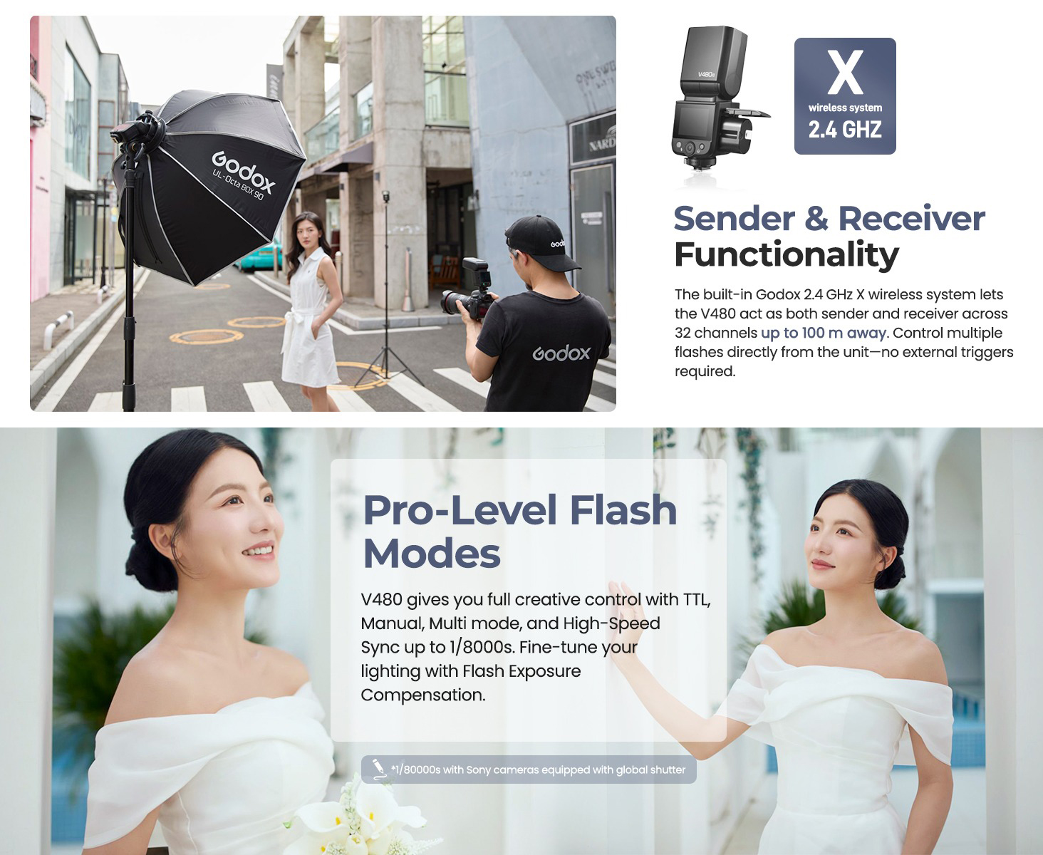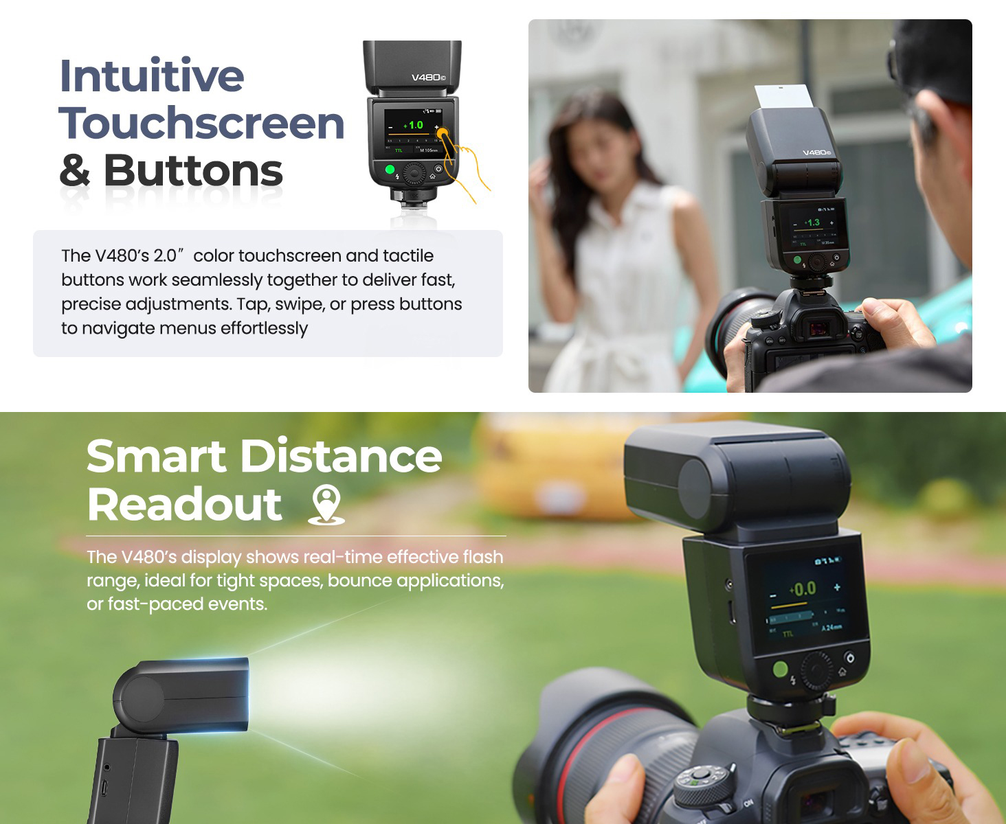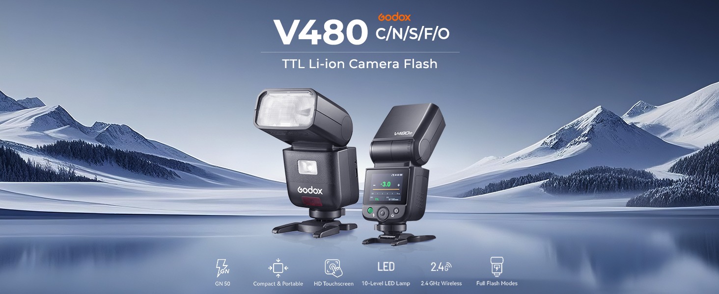 Godox V480 C/N/S/F/O TTL Li-ion Speedlite On-Camera Flash for Sony / Nikon / Fujifilm / Olympus & Panasonic Camera with Wireless 2.4GHz X Control, Full-Power Flashes, Hot Shoe-Mounted, Touchscreen Design for Professional Studio Photography