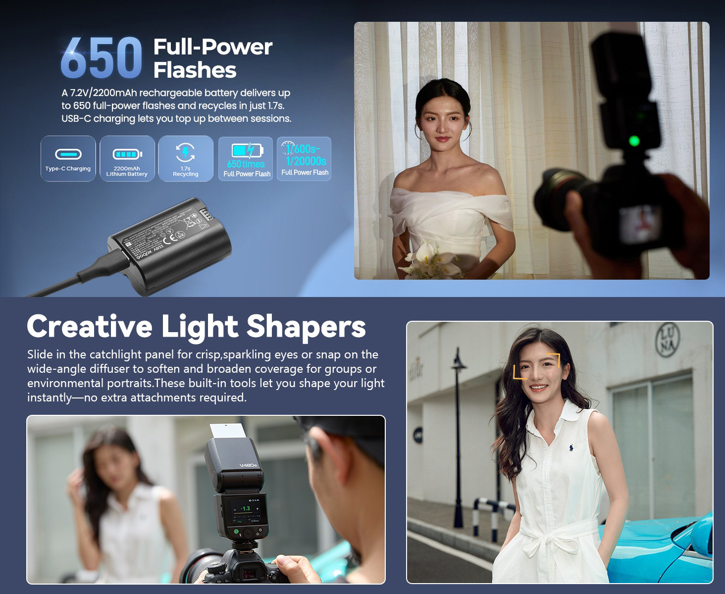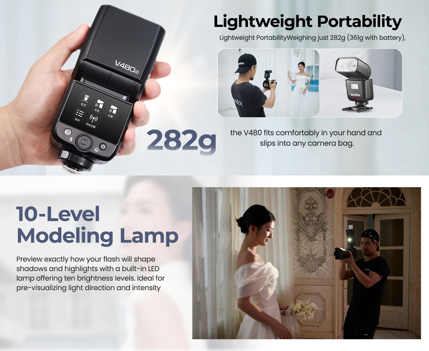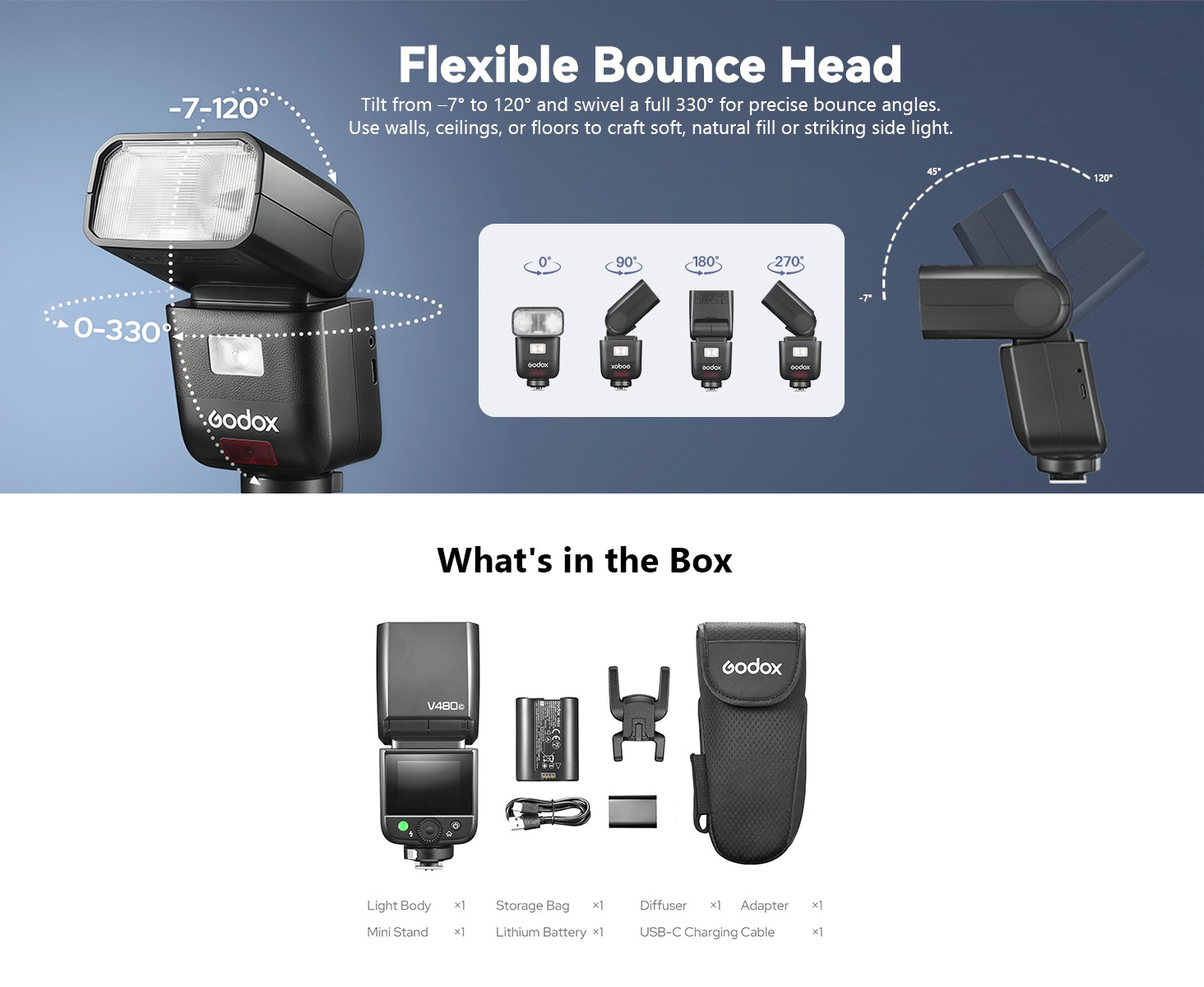 Delivering plenty of light in a portable flash body, the Ving V480 C/N/S/F/O TTL On-Camera Flash from Godox combines their 2.4 GHz X system for wireless flash control and TTL auto flash capability. This is compatible with Canon E-TTL / E-TTL II, Nikon i-TTL, Sony ADI / P-TTL, FUJIFILM TTL, Olympus/Panasonic TTL and also offers manual, multi, HSS, and second curtain sync characteristics. The V480 is similar to the Godox V860III and V350 flash units— smaller than the V860III and bigger and more powerful than the V350—designed as a medium-size, compact, yet powerful lighting solution with advanced features. A convenient LED modeling light is located right in the center of the flash body. Experience fast recharge and long-lasting shoots with a versatile flash head that tilts from -7 to 120° and rotates 330°. The flash runs on an included rechargeable battery to allow recycling times of 1.7 sec, providing enough energy for up to 650 full-power flashes.