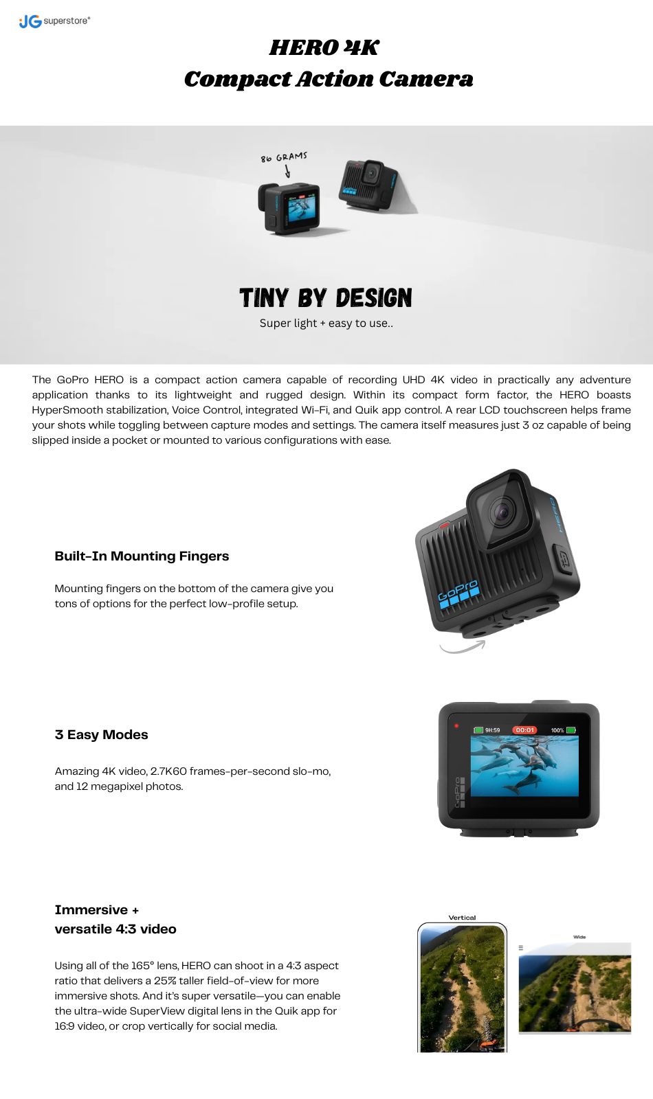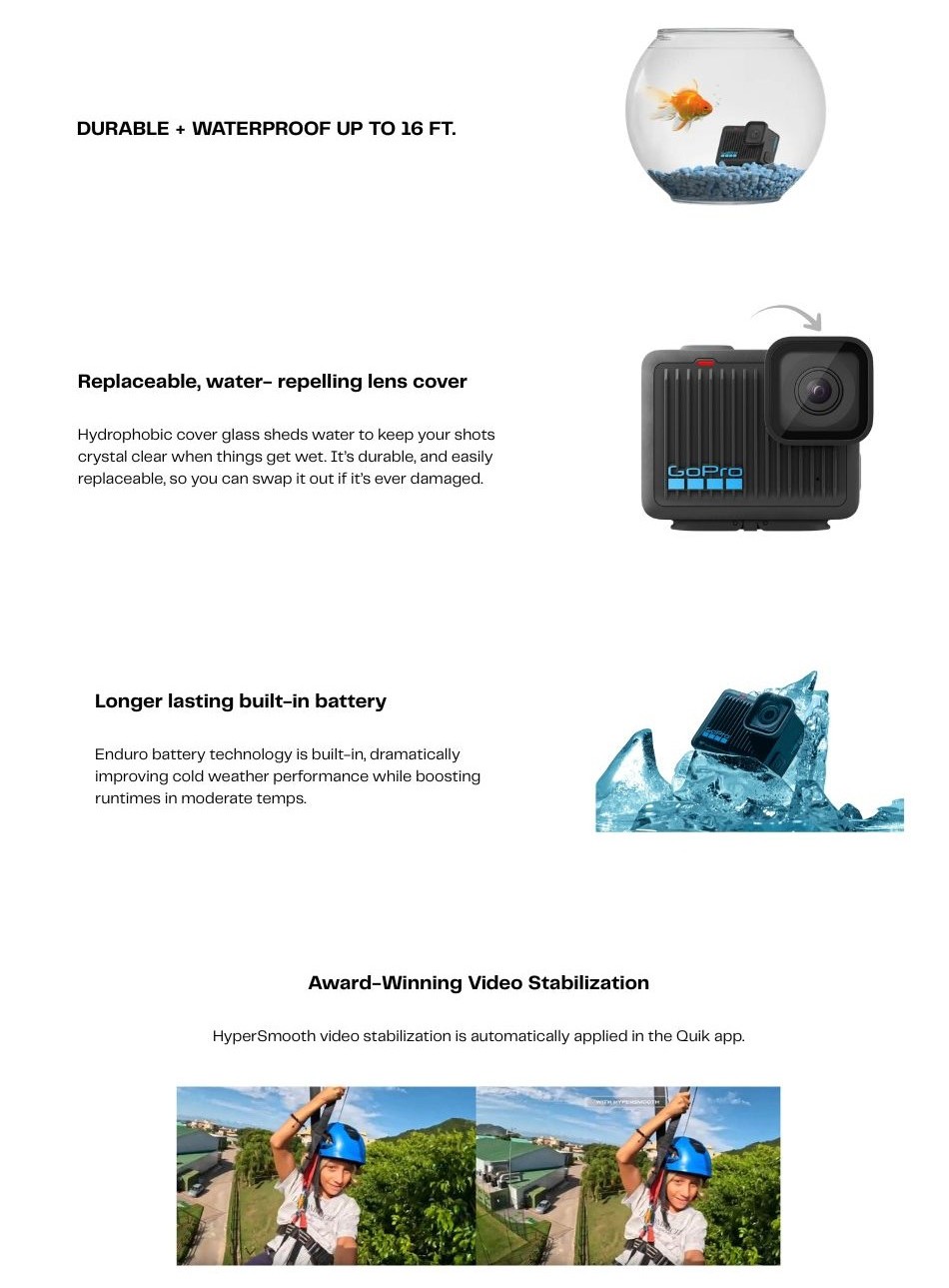 Tiny by design and easy to use, our smallest 4K camera features a rugged super-light design that’s a fraction of the size and weight of other GoPro cameras, but still waterproof to 16ft (5m). Streamlined controls let you record 4K video, immersive photos and slo-mo shots with a press of the Shutter button. After recording, play back your video on the GoPro Quik app. HyperSmooth video stabilization will automatically smooth out the shakes in your footage. Plug HERO in to charge and your footage will be uploaded to the cloud, turned into a highlight video and sent to your phone so you can relive your adventure and share the fun.