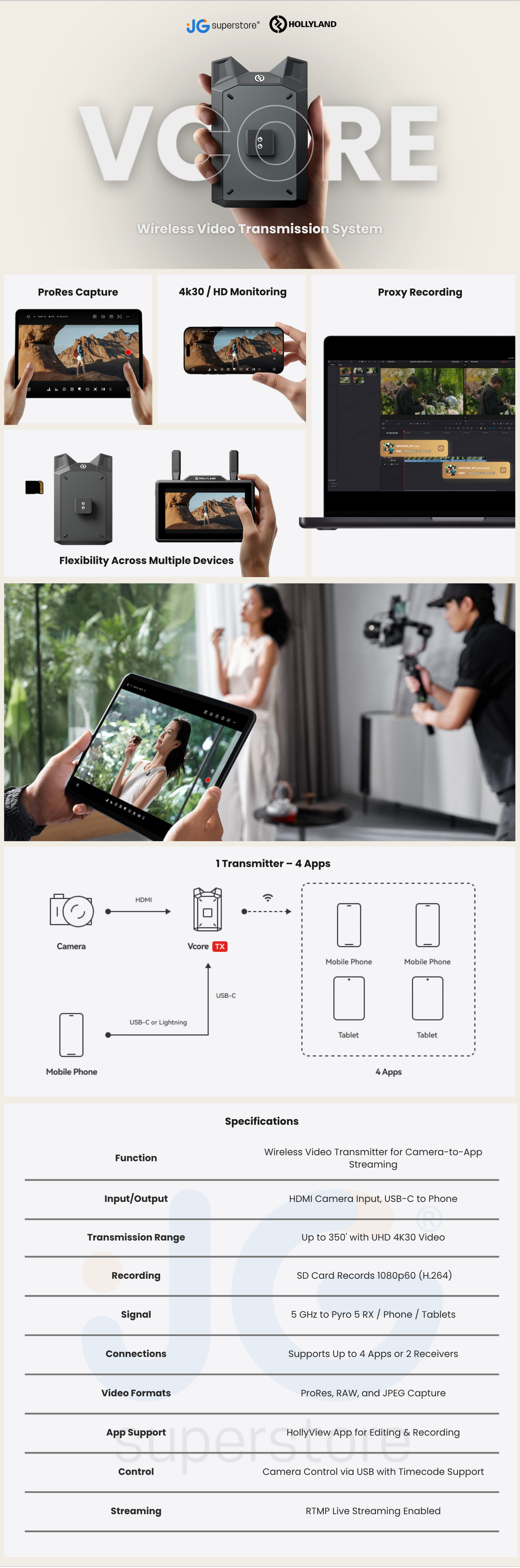 Add 4K30 wireless video monitoring and live streaming to your production using the versatile Vcore Wireless Video Transmission System from Hollyland. The compact, versatile Vcore transmitter installs easily onto your camera to provide easy remote camera monitoring using up to four tablet/smartphone app devices or via the optional Pyro wireless receiver/monitor. Features include HDMI and USB-C camera input, built-in battery, internal recording to SD card, clear 4K30 video transmission, H.264/ProRes recording, and HollyView app control.