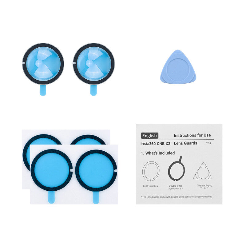 The Insta360 Lens Guards for the ONE X2 camera add protection from scratches and dirt to the front and rear lenses of the camera. They attach with supplied adhesives and can be removed with the included prying tool and attached again. An adhesive comes attached to each lens guard, and six additional ones are included. Replacement adhesives are also available from Insta360.