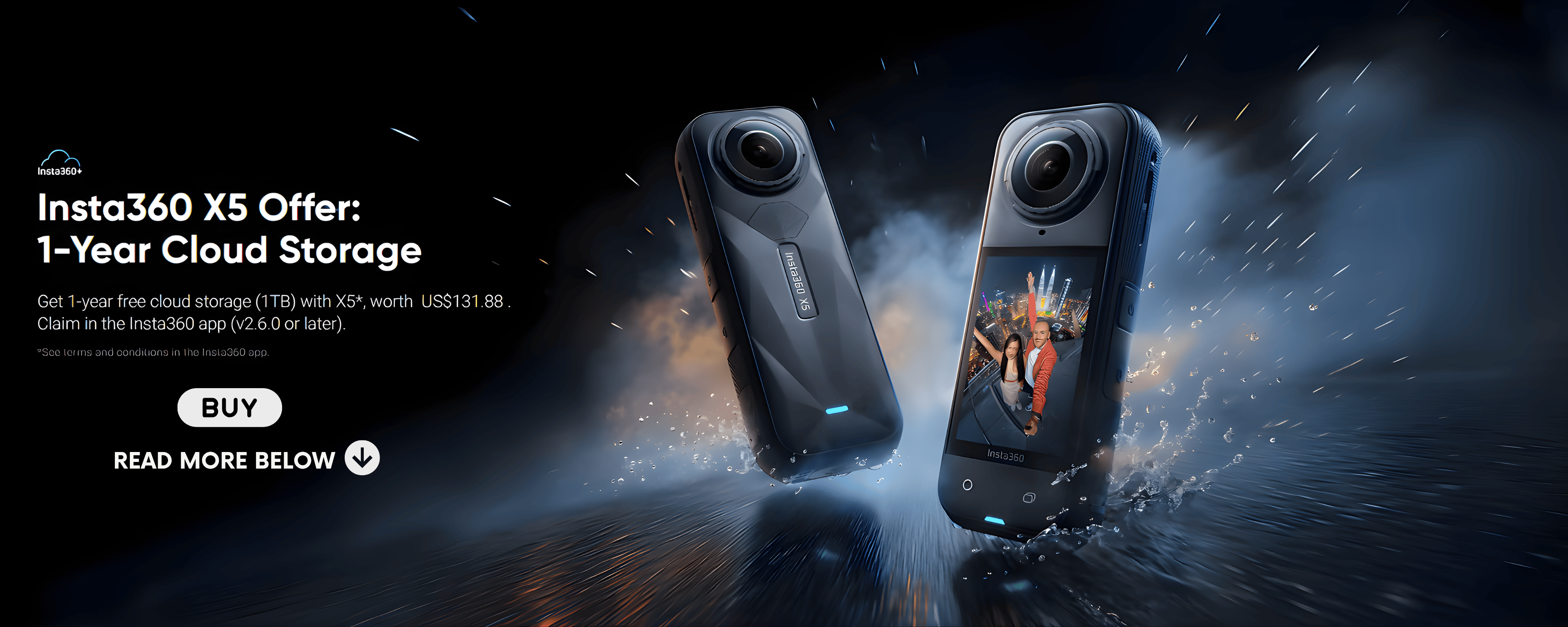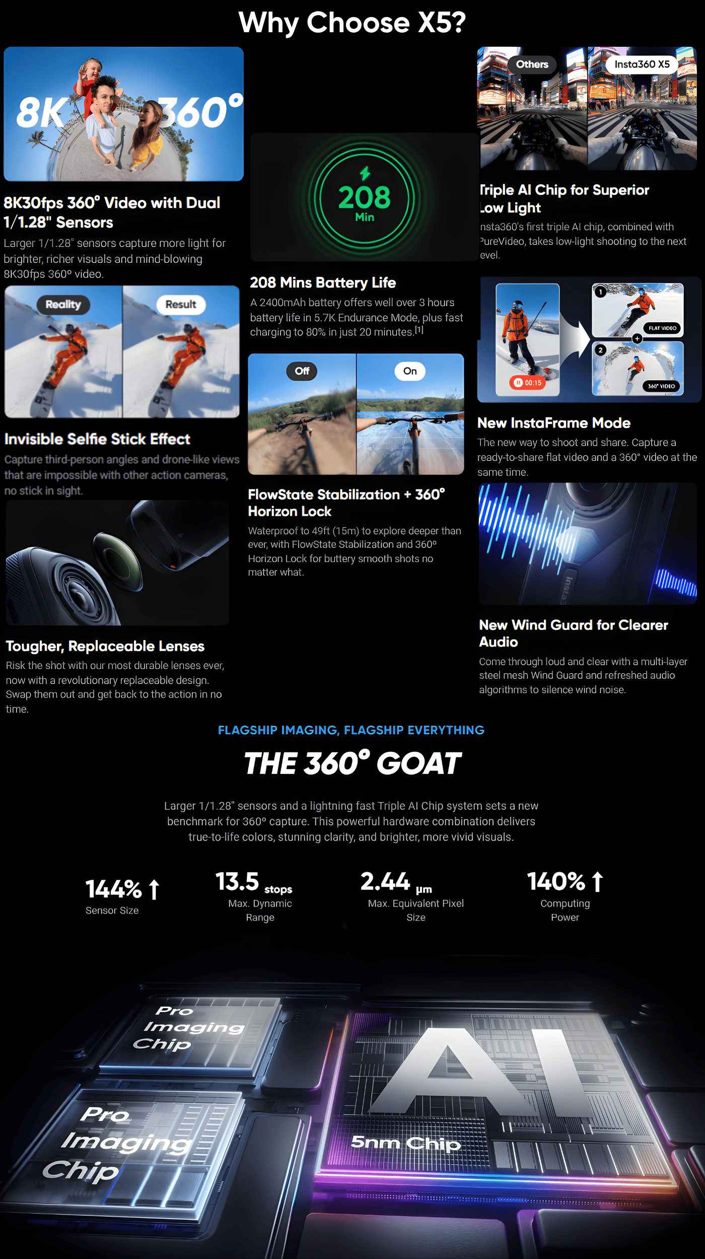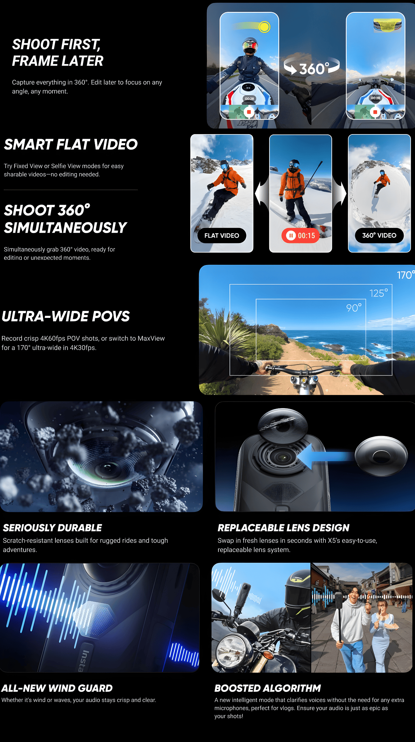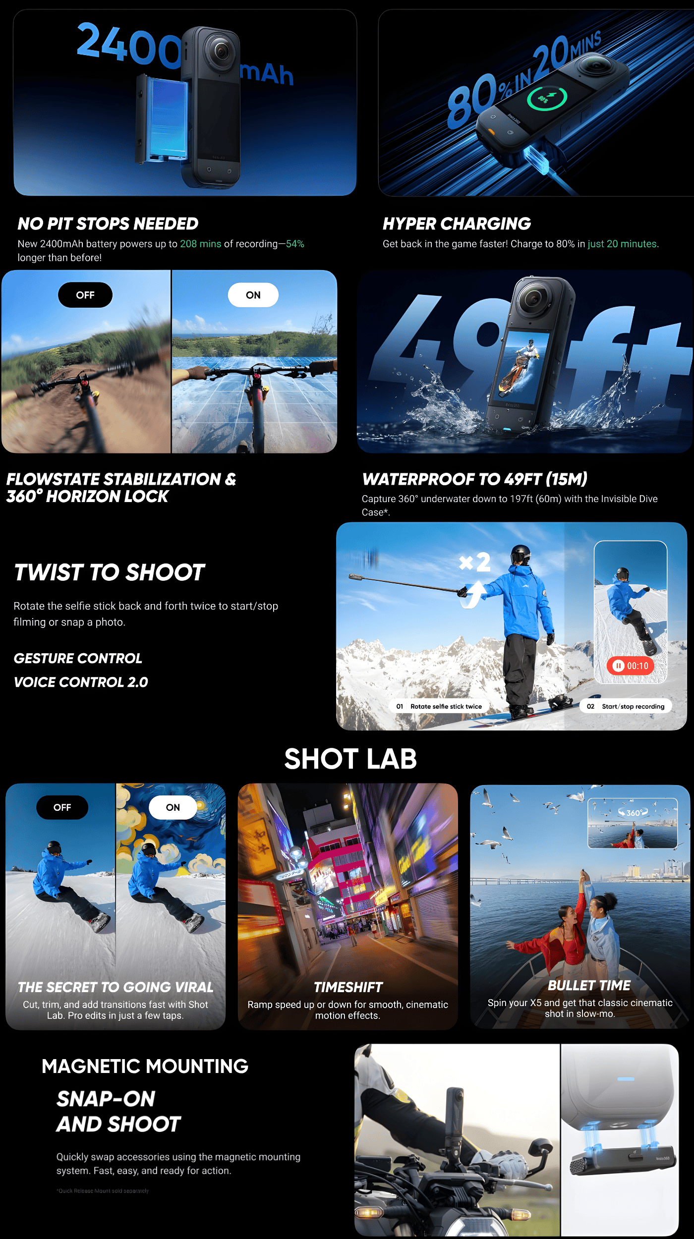 Insta360 X5 shoots crisp 8K 360° video with HDR and PureVideo for improved low-light. Works in dual or single-lens mode and built for action shots with easy AI tools. Features Bullet Time, time shift, loop recording, and time-lapse. Rugged and waterproof to 49 ft, delivering up to 88 minutes of runtime with its 2400mAh battery.