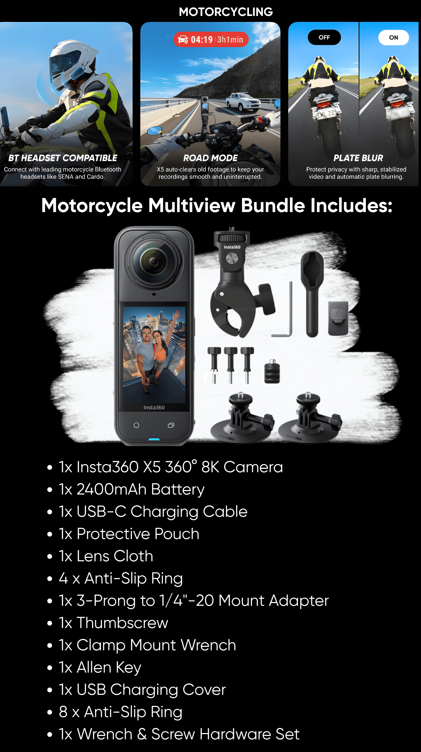 Upgrade your production to cinematic 360° video with the powerful Insta360 X5 360 Action Camera Motorcycle Multiview Bundle. This set includes the X5 360 camera, USB-C cable, protective pouch, lens cloth, and a heavy-duty motorcycle mounting bundle.