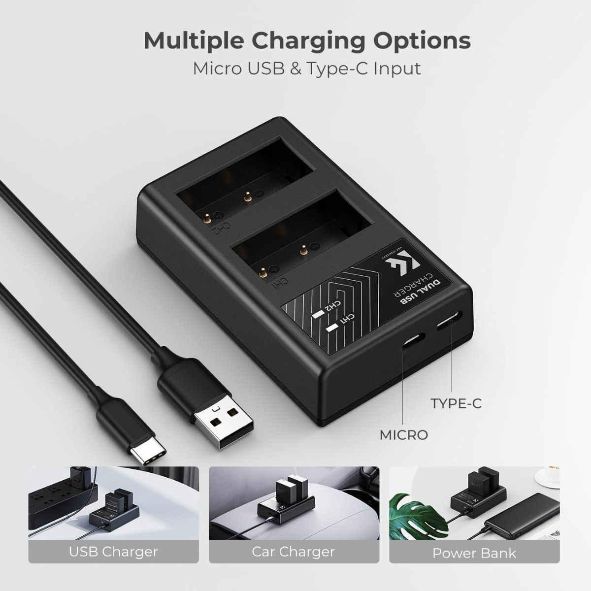 ● The charger features dual slots, allowing you to charge two batteries simultaneously, saving time and ensuring you always have a backup power source.