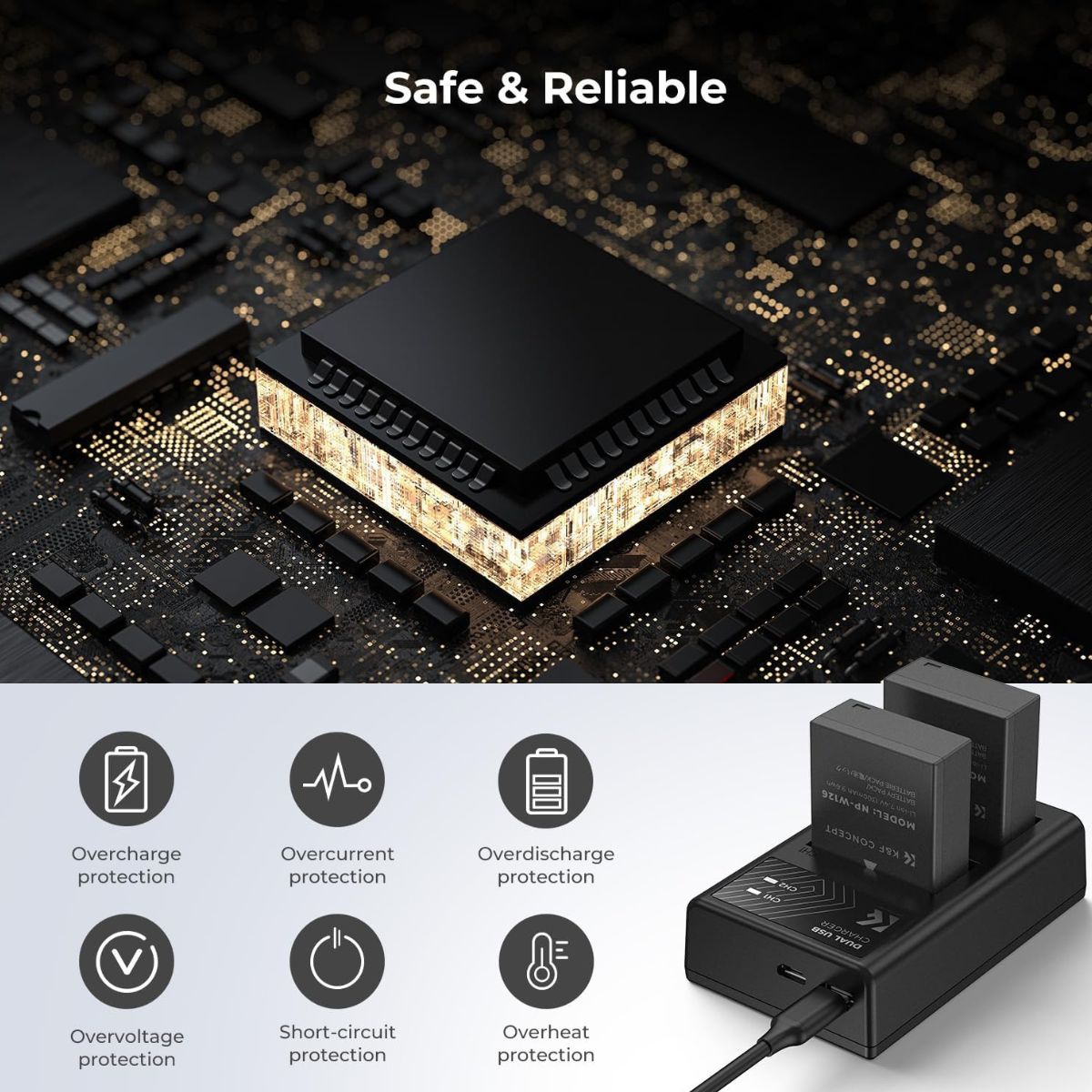 ● Built-in advanced safety features such as overcharge protection, short circuit protection, and overheating protection, ensuring the safety of your camera and batteries during charging and usage.