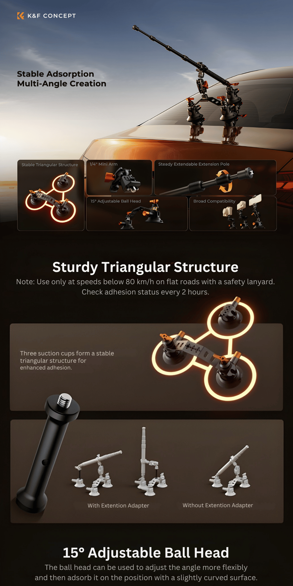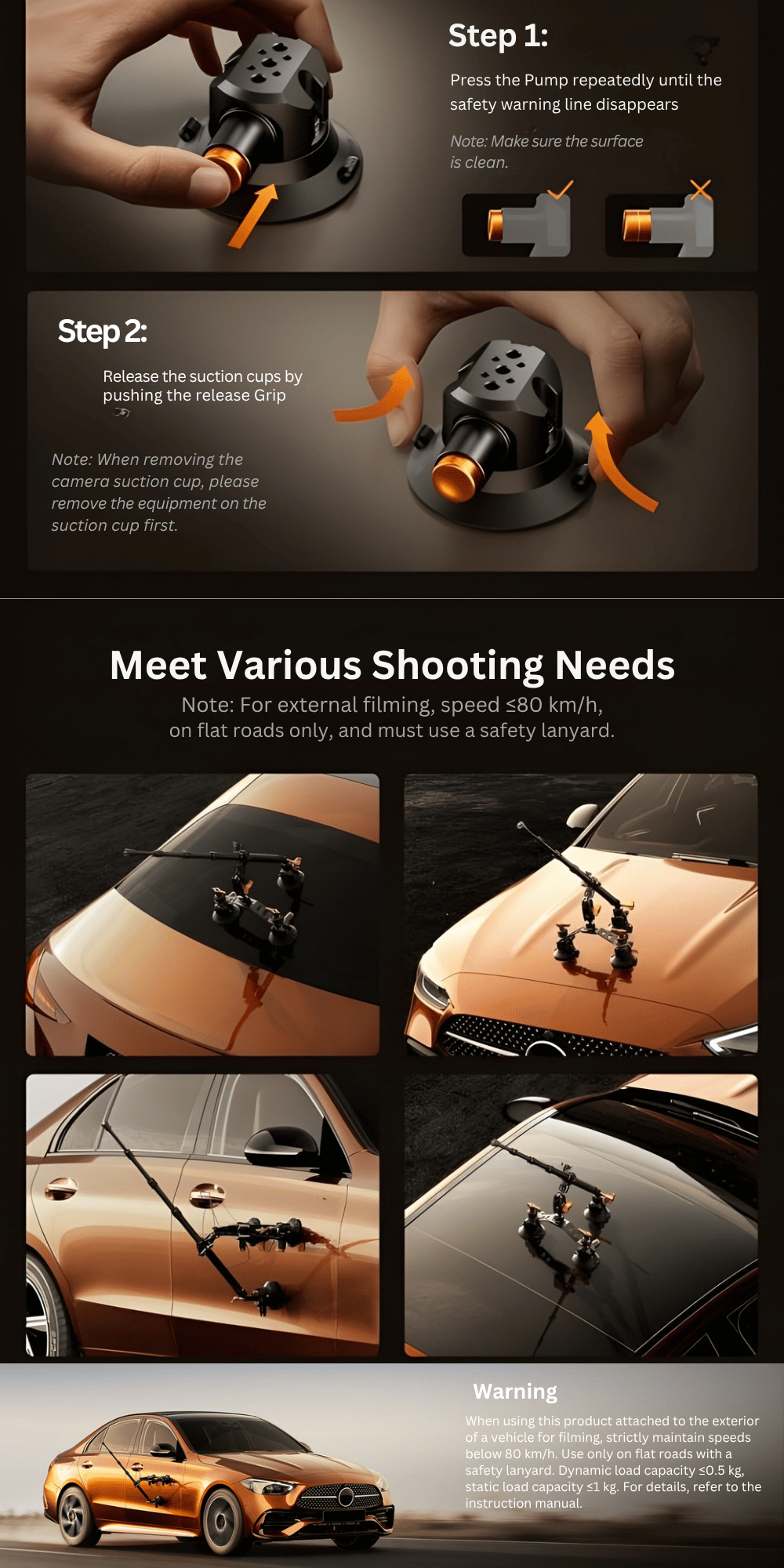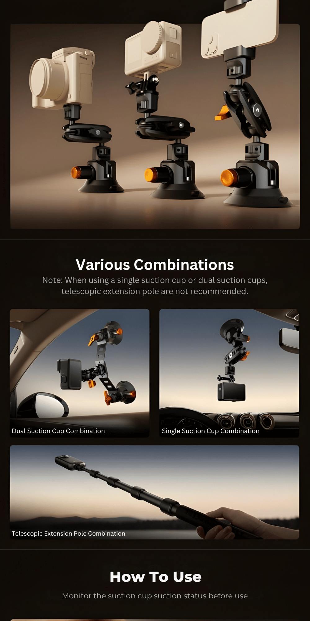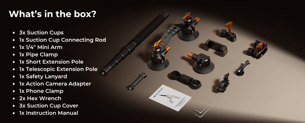 The system also offers flexible setup options for different shooting scenarios. You can configure it in multiple ways, such as using a single suction cup with a magic arm or adapter, dual suction cups with a magic arm, or a triple suction setup combined with a magic arm, tube clamp adapter, and extension pole. It can also be paired with an extension pole and an action camera adapter, though using an extension pole with single or dual suction setups is not recommended.