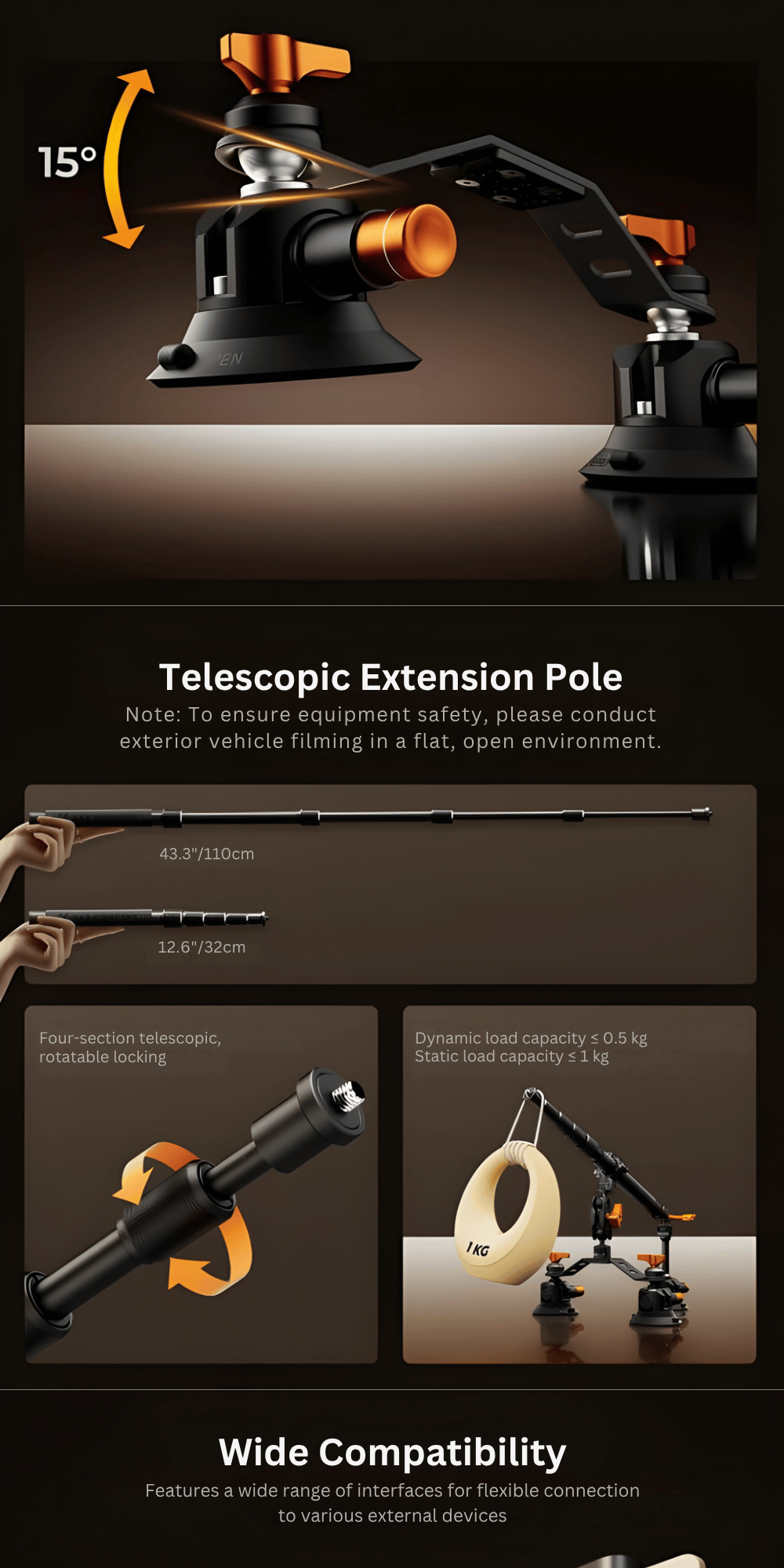 Additionally, the included dual-purpose selfie stick has four telescoping sections that extend from 12.5 inches (32 cm) to 43.3 inches (110 cm). It can be used handheld for panoramic shots or attached as an extension pole to the suction mount. The top 1/4" screw supports phone clamps and action camera adapters, while the dual ball head allows full 360° angle adjustment. A safety lanyard is also included for added protection.
