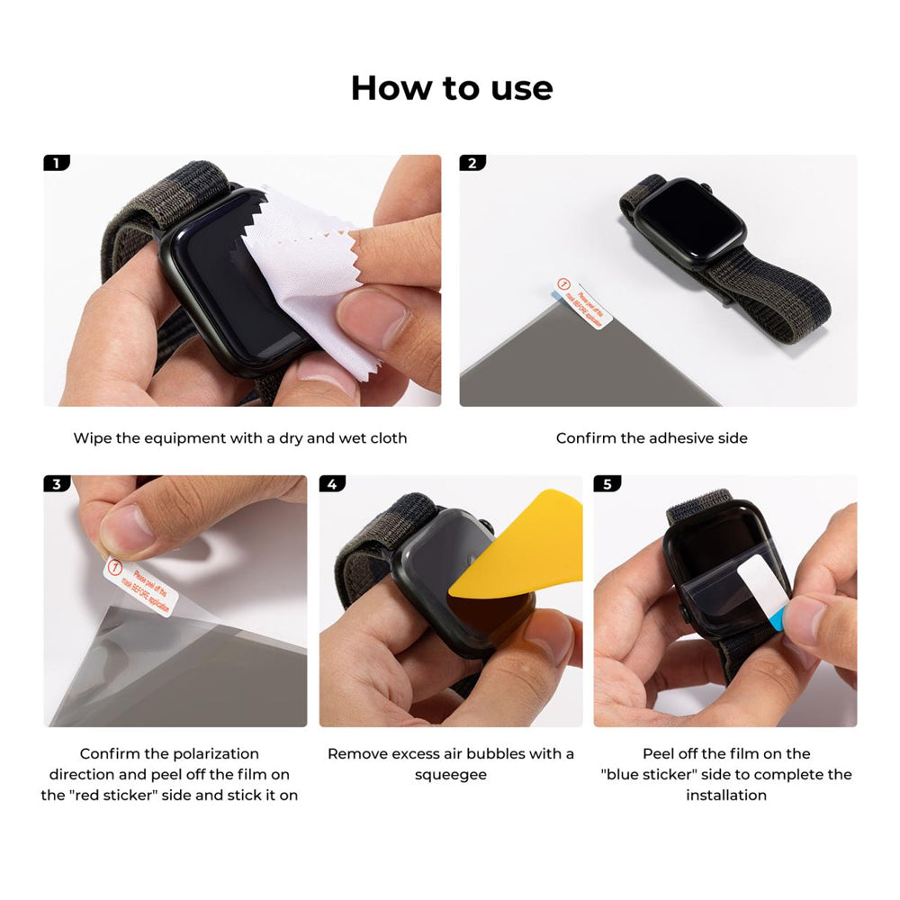 Simple Application: While keeping the power on, take the screen as the center point, the sticky side is overlapped on the screen, and the polarizing film rotates 360 degrees clockwise. Find a clear location, and mark the location. After cleaning the surface of any dust particles, cut the film to the desired shape and apply it for immediate use.
