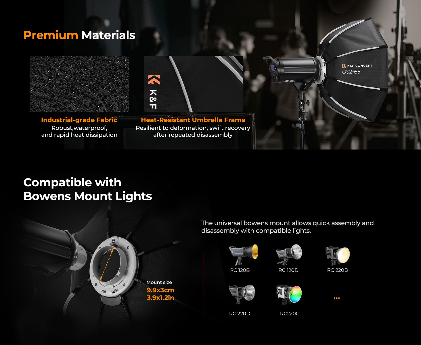 Compatibility: Bowens Mount Speedlites, Mono Lights, Continuous LED Lights