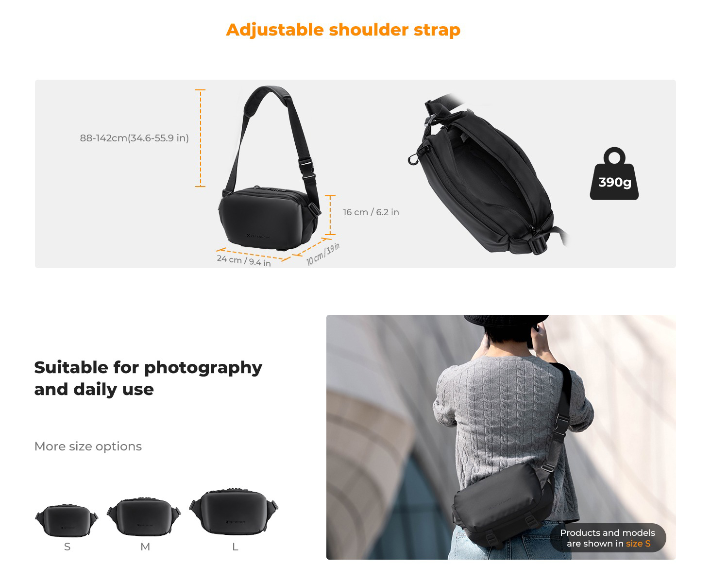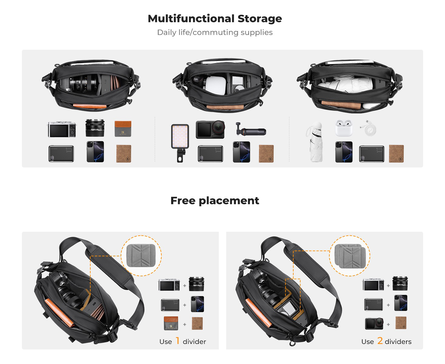 The K&F KF13-188 Sling Bag is a compact, stylish solution for photographers and creators who want protection, organization, and portability in one. With a thoughtful interior design including removable padded dividers, it securely houses a mirrorless or DSLR body plus one lens or accessories. The bag is built with soft yet durable padding, a soft lining to protect gear from scratches, and a weather-resistant exterior—ideal for daily shoots, travel, or on-the-go sessions. An adjustable crossbody strap and tripod/external gear straps add convenience, while quick-access zippers make gear retrieval effortless without exposing everything.