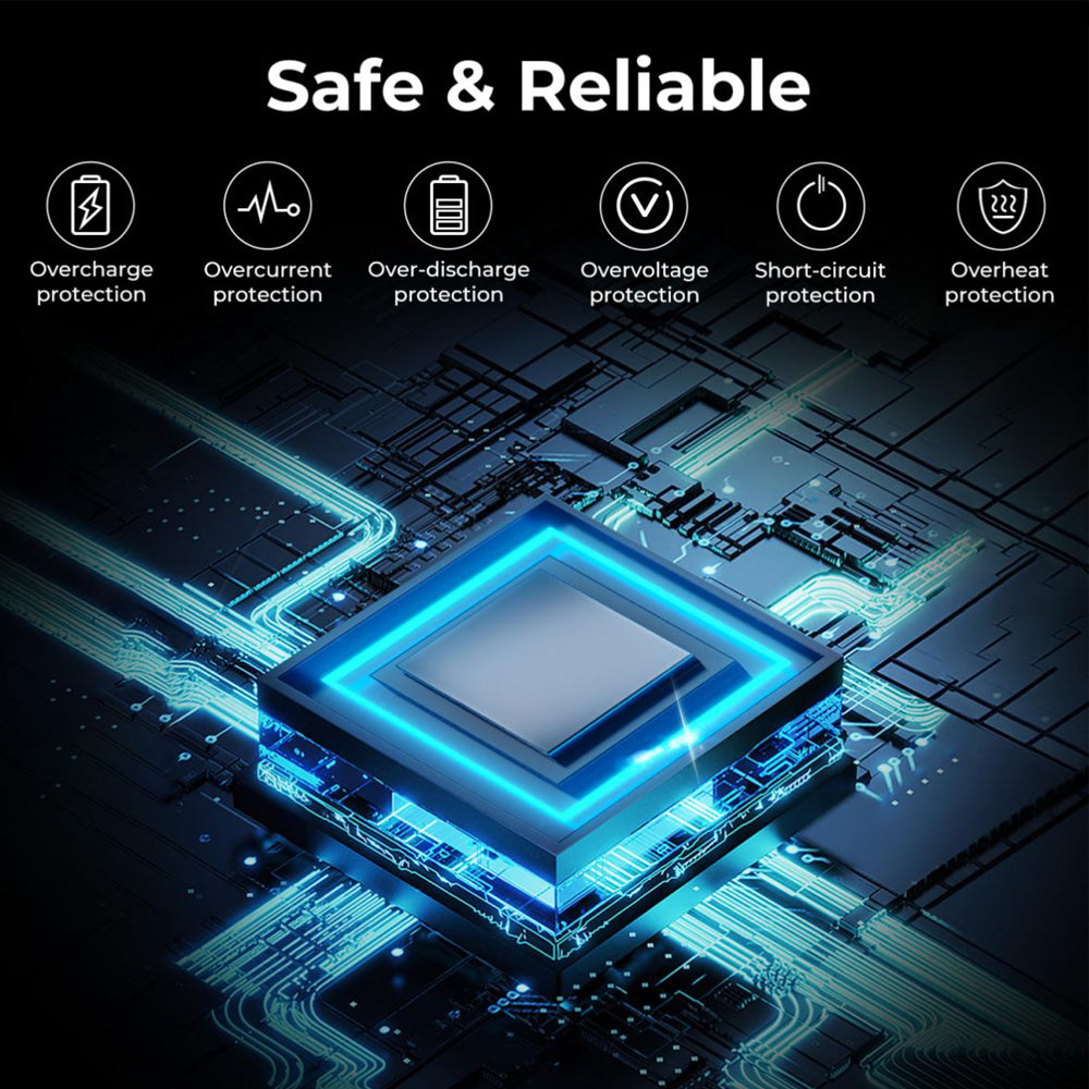- Multiple Protection: Over-charging, over-current, high-temperature, over-voltage, and short-circuit protection ensures safety