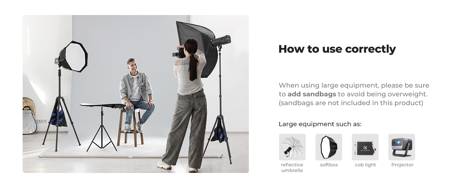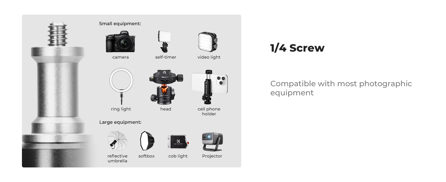 The K&F Light Stands are compact and portable solutions for photographers and videographers. Made from lightweight aluminum alloy, these stands offer the perfect balance of sturdiness and mobility. Both are ideal for travel, outdoor shoots, and versatile studio setups, providing adjustable height, high load capacity, and wide compatibility with various lighting and camera gear.