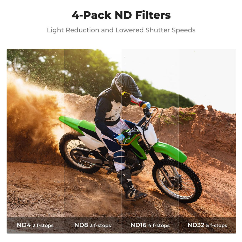 • 4 Pack ND Filters Kit: This set includes ND8 + ND16 + ND32 + ND64 Lens filters, which help reduce exposure by 3 stops to 6 stops, ideal for various bright sunlight conditions while enhancing image details naturally. It blocks the corresponding value of light to the action camera during dynamic outdoor activities to adjust the camera parameters to achieve motion blur effect.