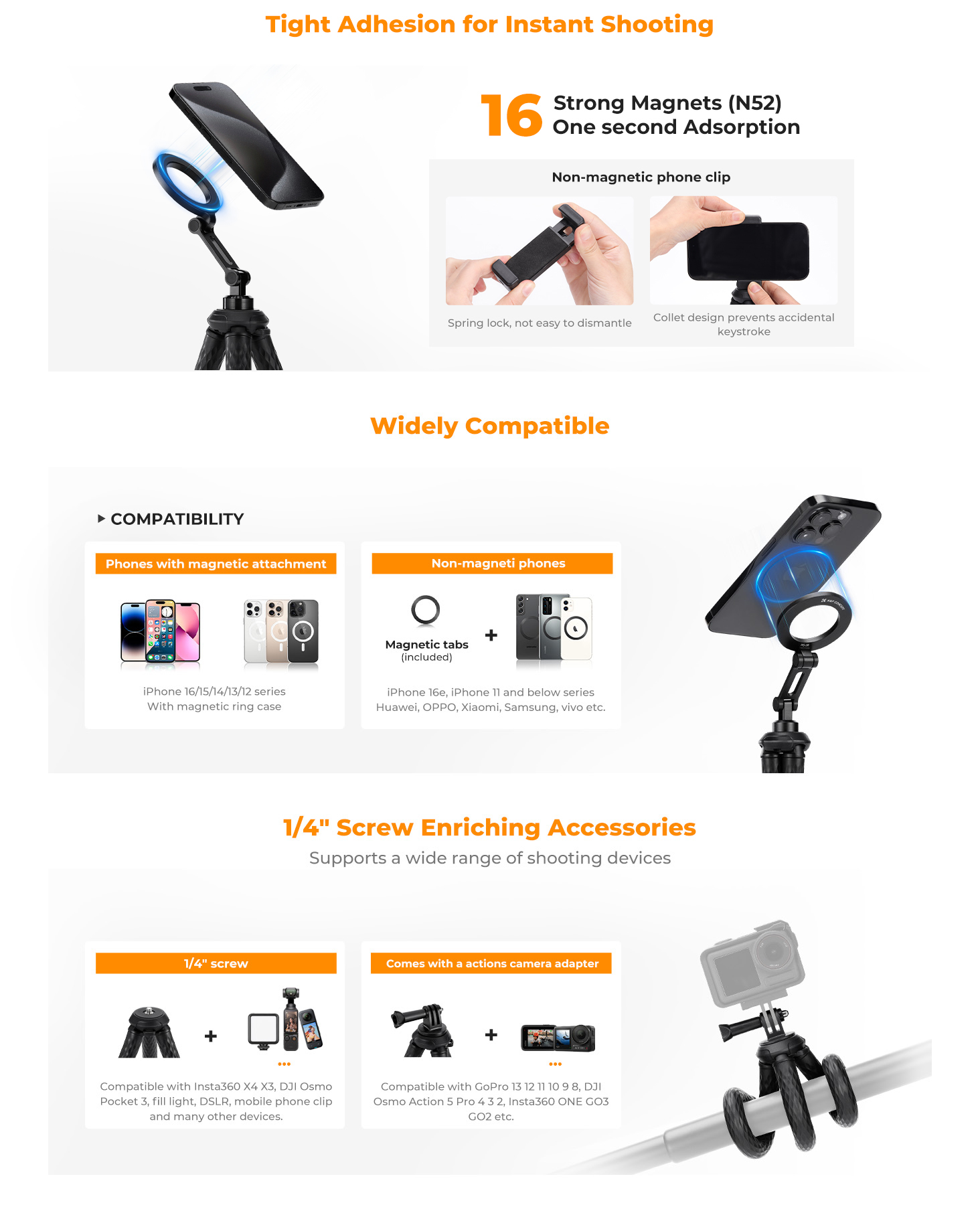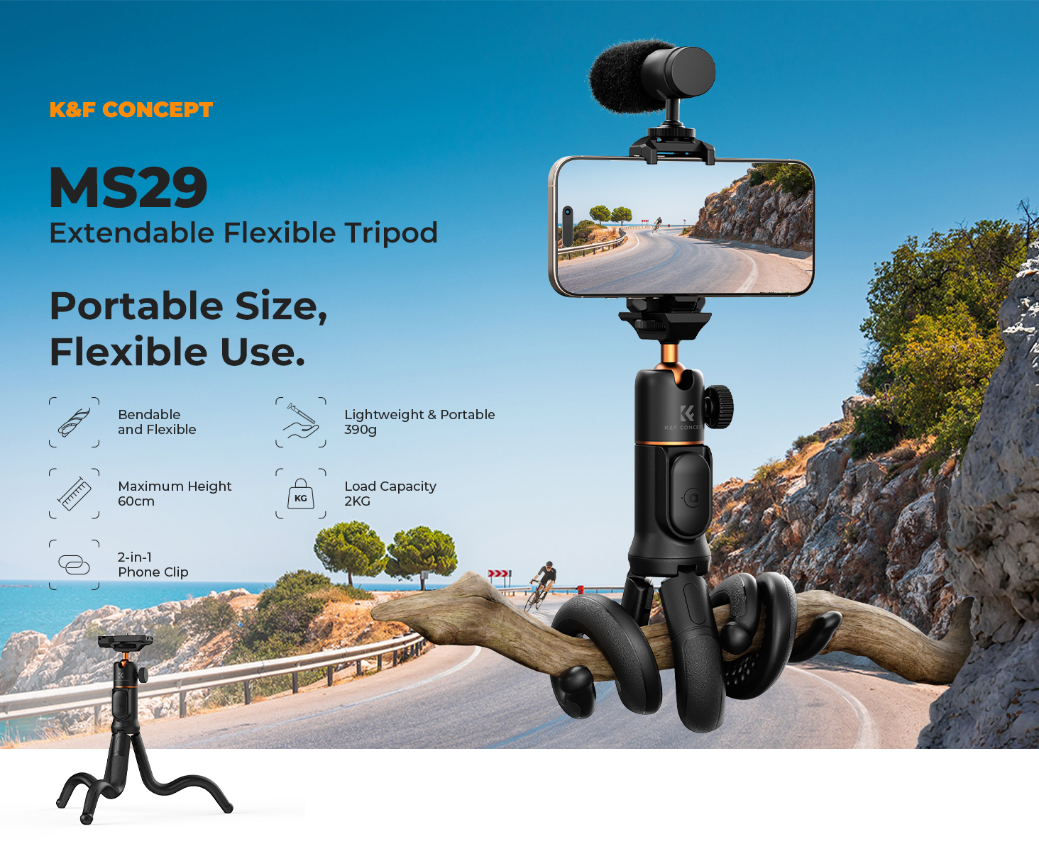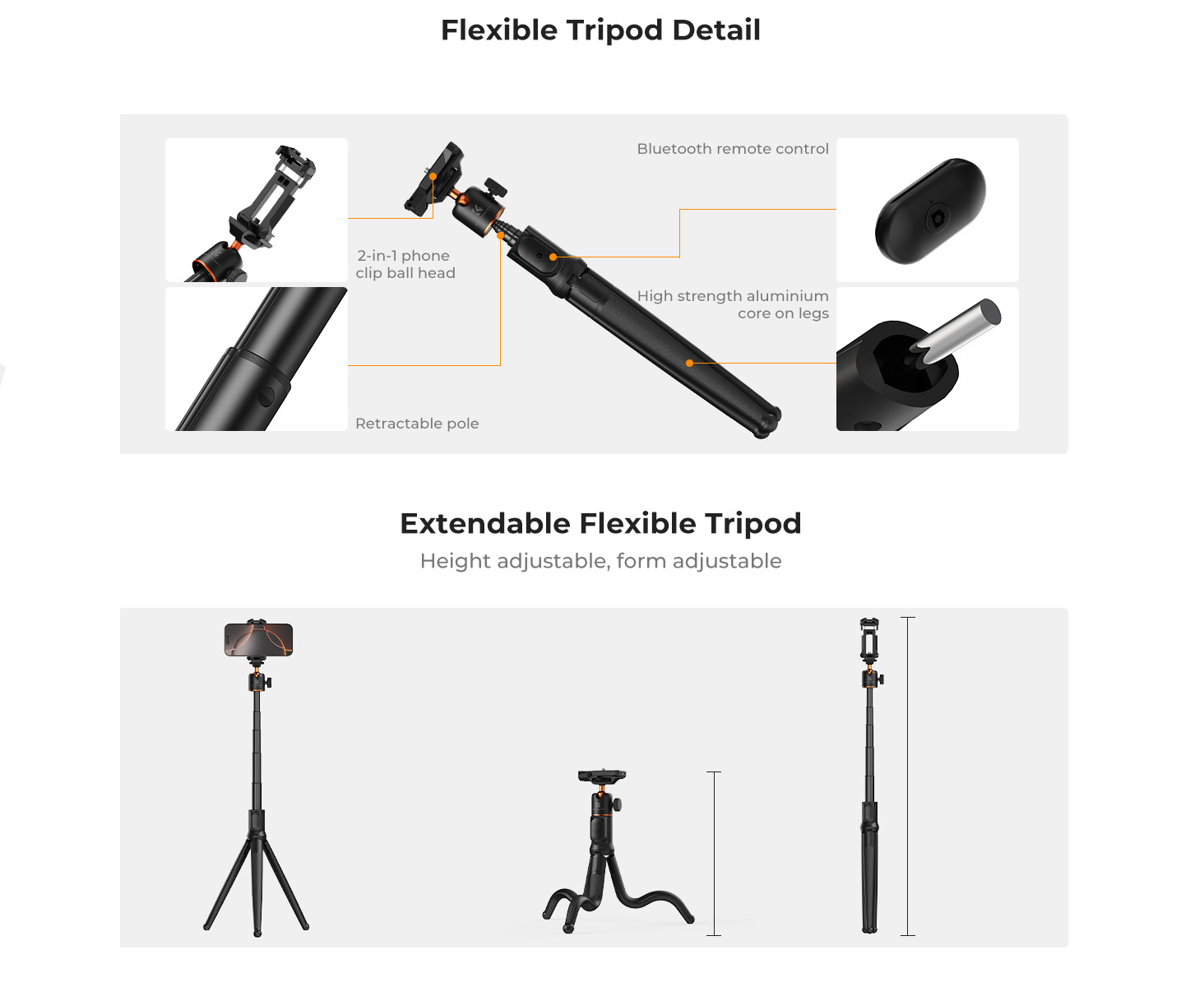 Flexible Adjustable Tripod: Extends from 10.6"" (26 cm) to 23.6"" (60 cm) for various shooting angles. Bendable legs can wrap securely around railings, branches, or handlebars, ensuring stable support on different surfaces.