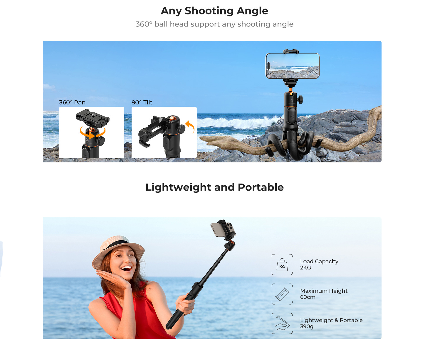 360-Degree Ball Head: Gorilla tripod offers 360° horizontal rotation and 90° vertical tilt, allowing versatile angles for landscapes, portraits, or action shots.