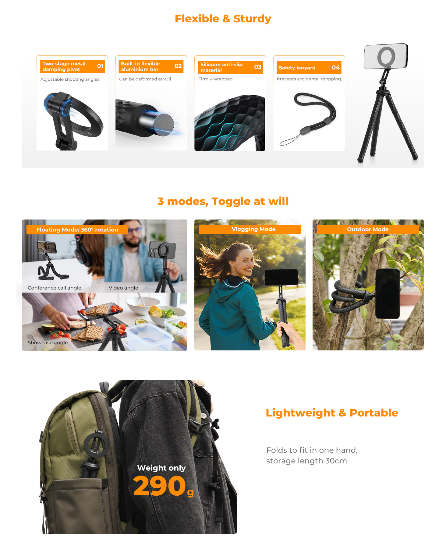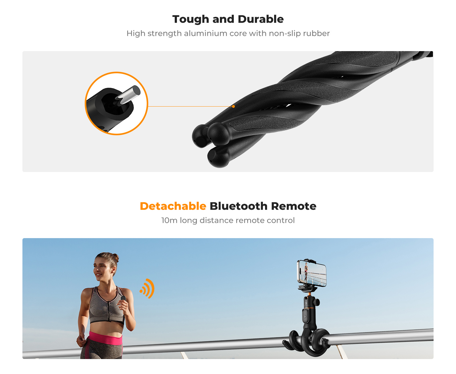 ● Tripod Material: Resilient, flexible, and sturdy with high-quality silicone pads
