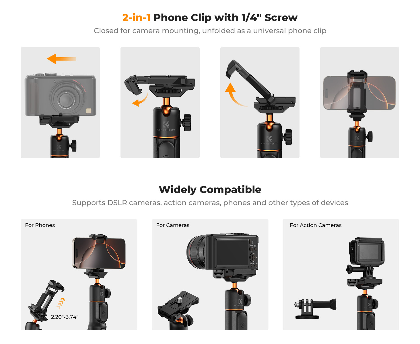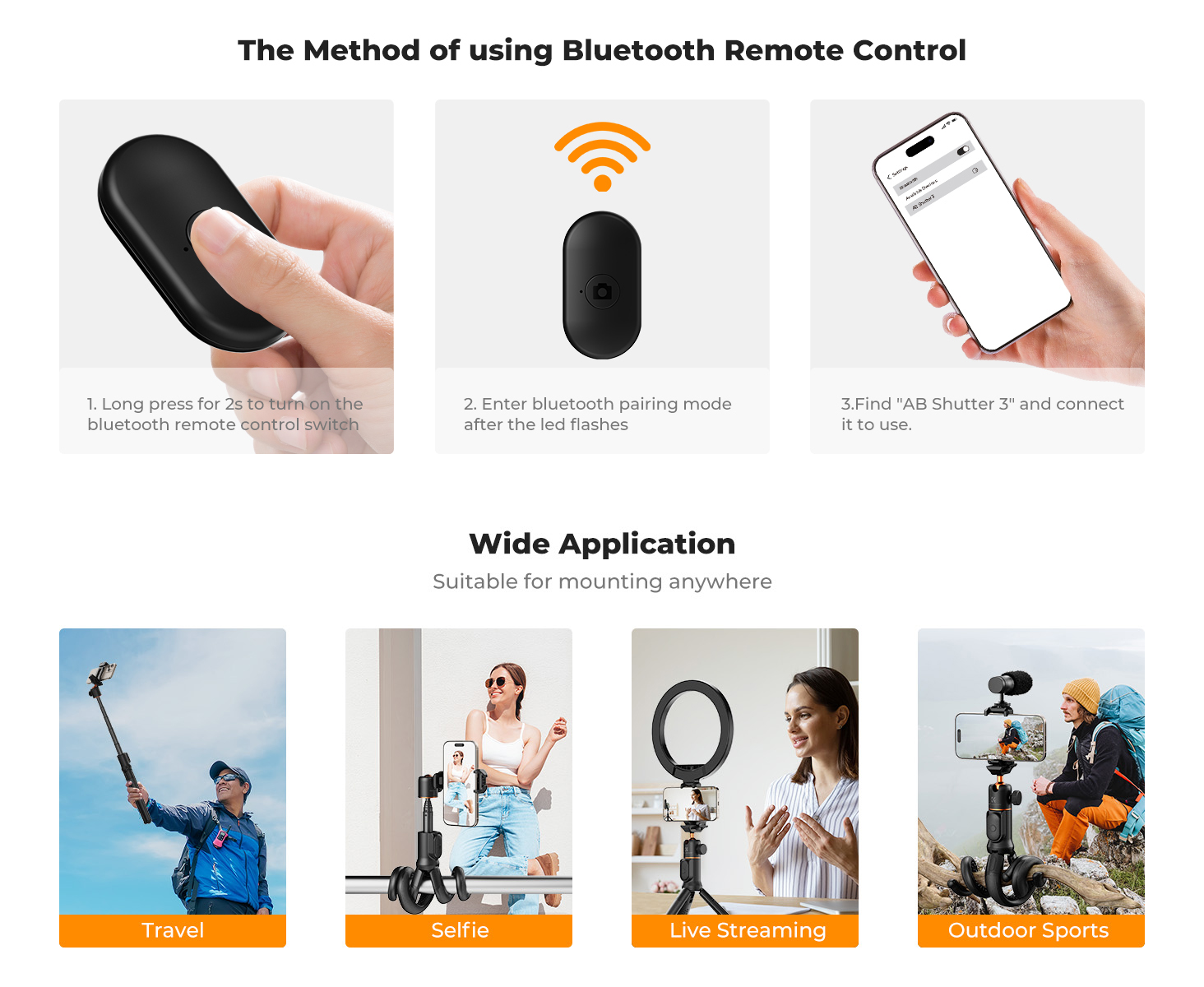 3-in-1 Design: The phone holder fits devices 2.2 to 3.7 inches wide, including iPhones, Samsung, and Huawei. Equipped with a 1/4'' screw and Go Pro adapter, compatible with cameras and GoPro, supporting up to 4.4 lbs. Wireless remote works with Android and iOS, no app required.