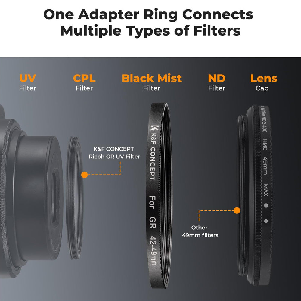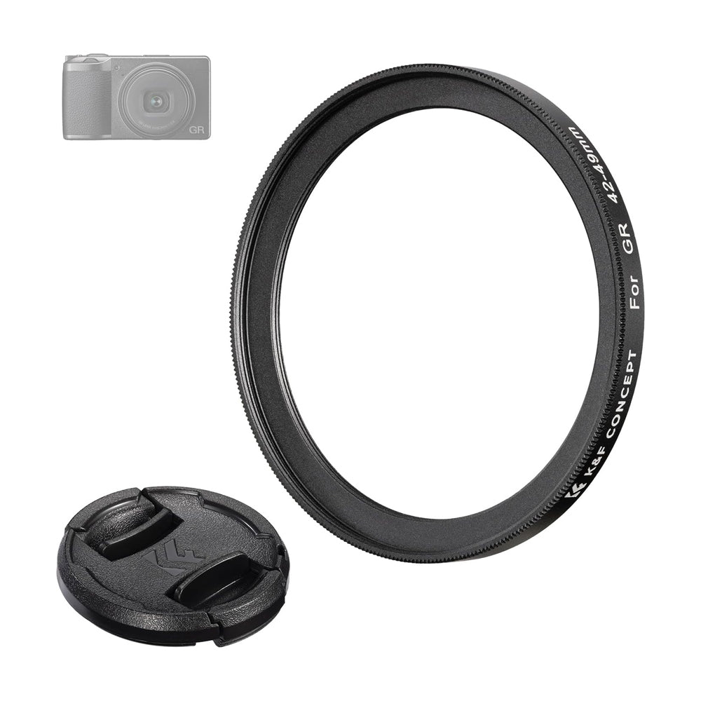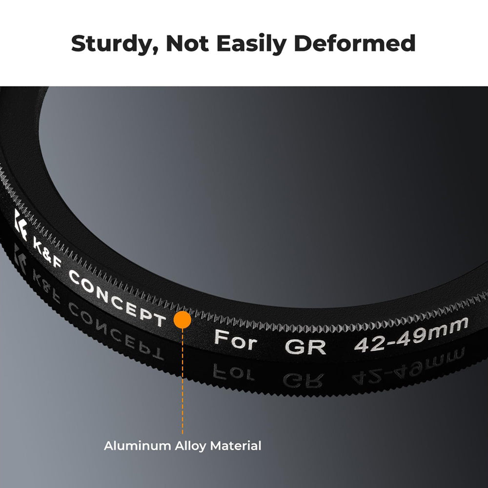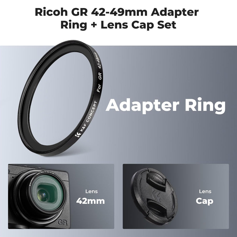 The K&F Ricoh GR 42-49mm Adapter Ring and Lens Cap Set is a durable and reliable solution for expanding the filter compatibility of your Ricoh GR IIIx, GR III, or GR II camera while offering a secure lens cap with a convenient center-pinch design.