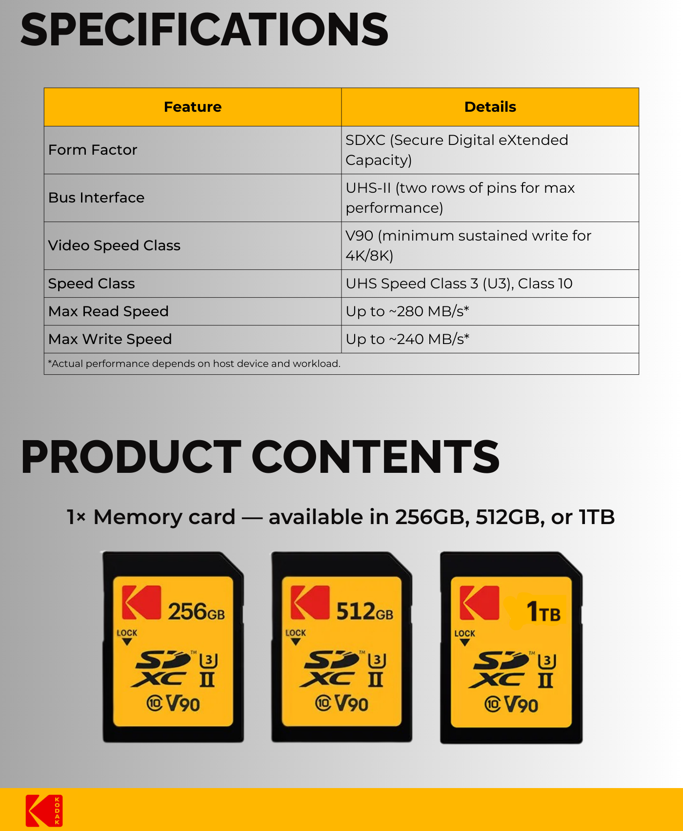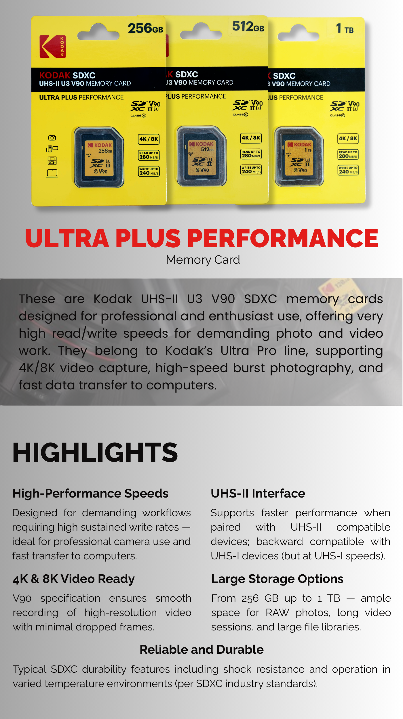 KODAK 1TB 512GB 256GB Ultra Plus Performance UHS-II U3 V90 SDXC Memory Card