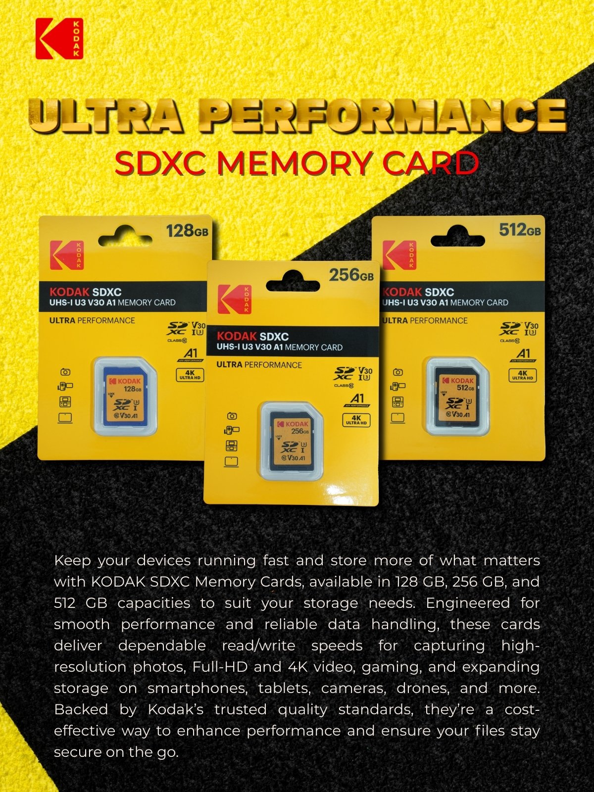 KODAK 512GB 256GB 128GB Ultra Performance Memory Card SDXC UHS-I U3 V30 A1