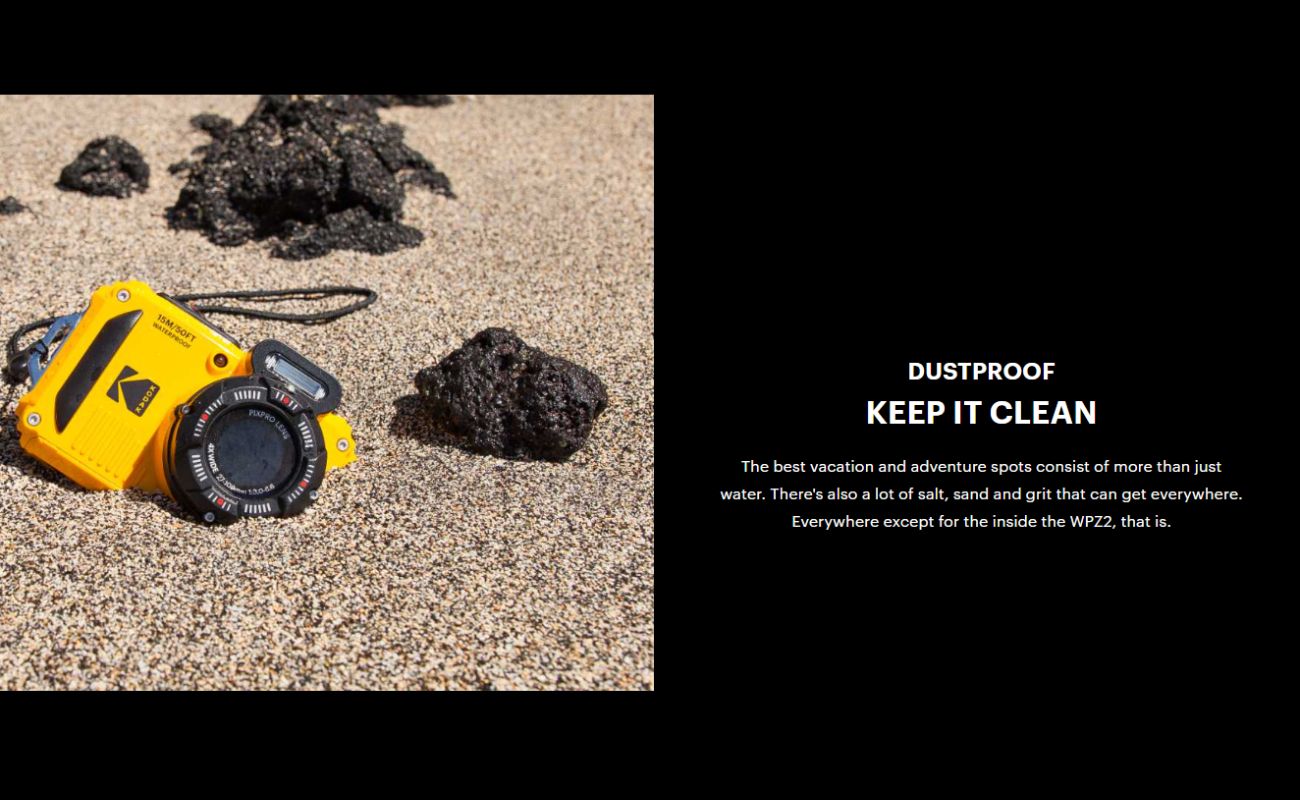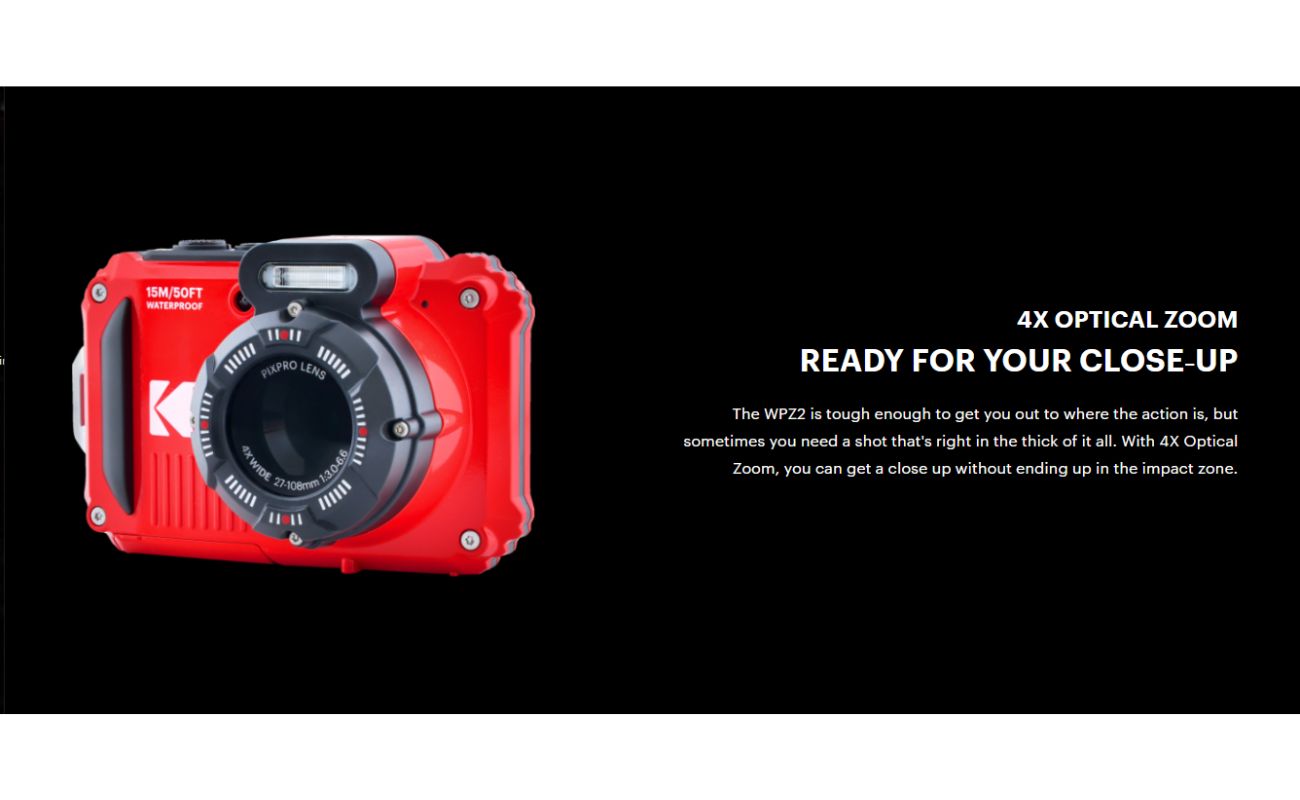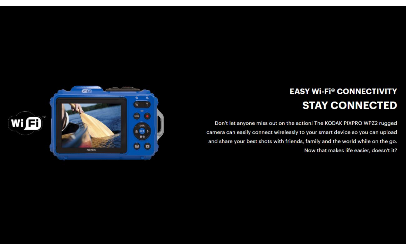 The KODAK PIXPRO WPZ2 Digital Camera is the perfect companion to get wet. Shockproof, dustproof, and adventure ready, the rugged WPZ2 was built to take on the go and be used in, on and under the water. With a host of scene modes to help you capture the best shot as well as HD video, the WPZ2 is not going to miss a beat.