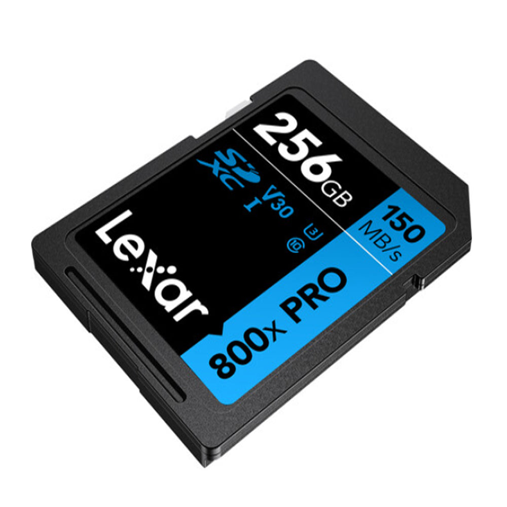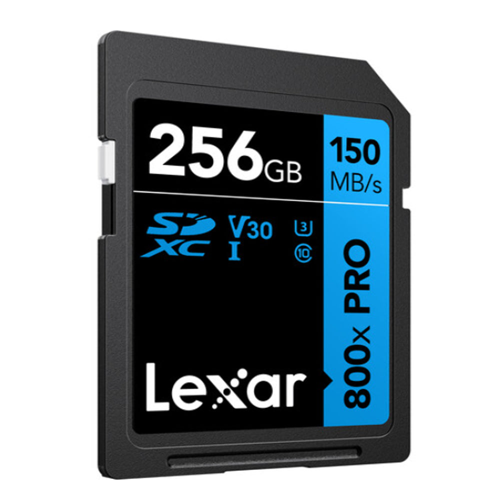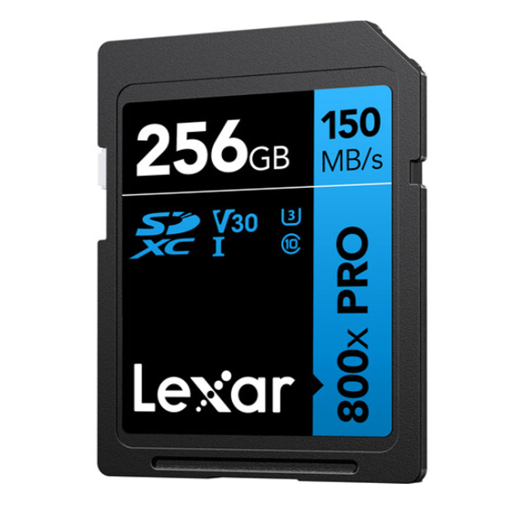 256GB High-Performance 800x PRO UHS-I SDXC Card (BLUE Series) from Lexar features a storage capacity of 256GB and may be used for 4K, Full HD, and 3D video, plus raw and JPEG photos. It can achieve read speeds of up to 150 MB/s, write speeds of up to 45 MB/s and, thanks to the V30 speed class rating, write speeds are guaranteed not to drop below 30 MB/s.