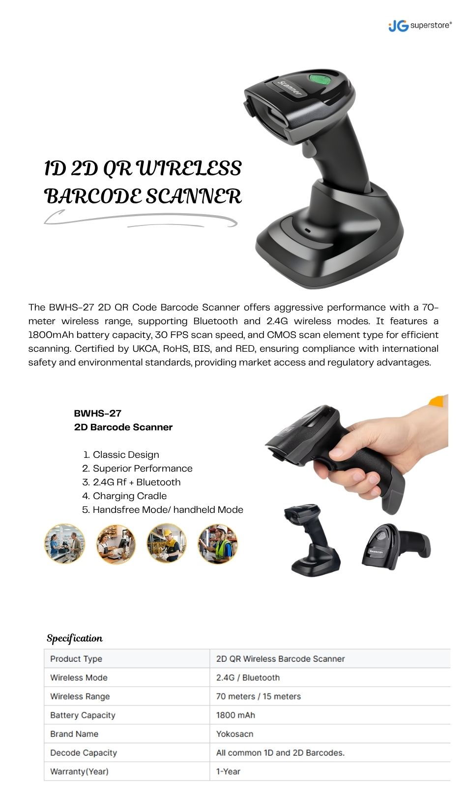 The BWHS-27 2D QR Code Barcode Scanner offers aggressive performance with a 70-meter wireless range, supporting Bluetooth and 2.4G wireless modes. It features a 1800mAh battery capacity, 30 FPS scan speed, and CMOS scan element type for efficient scanning. Certified by UKCA, RoHS, BIS, and RED, ensuring compliance with international safety and environmental standards, providing market access and regulatory advantages.