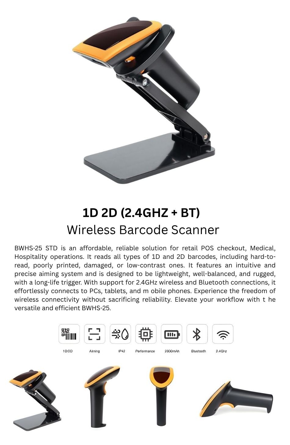 ► Handsfree Scanning: This 1D 2D barcode scanner comes with a foldable stand for handsfree scanning, allowing for convenient and efficient operations.