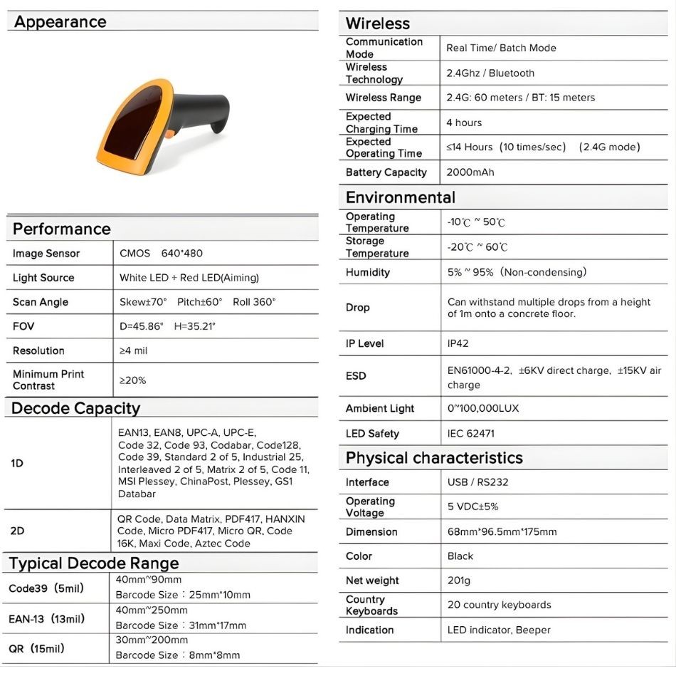 • 2D Wireless Barcode Scanner with CMOS 640×480 Sensor