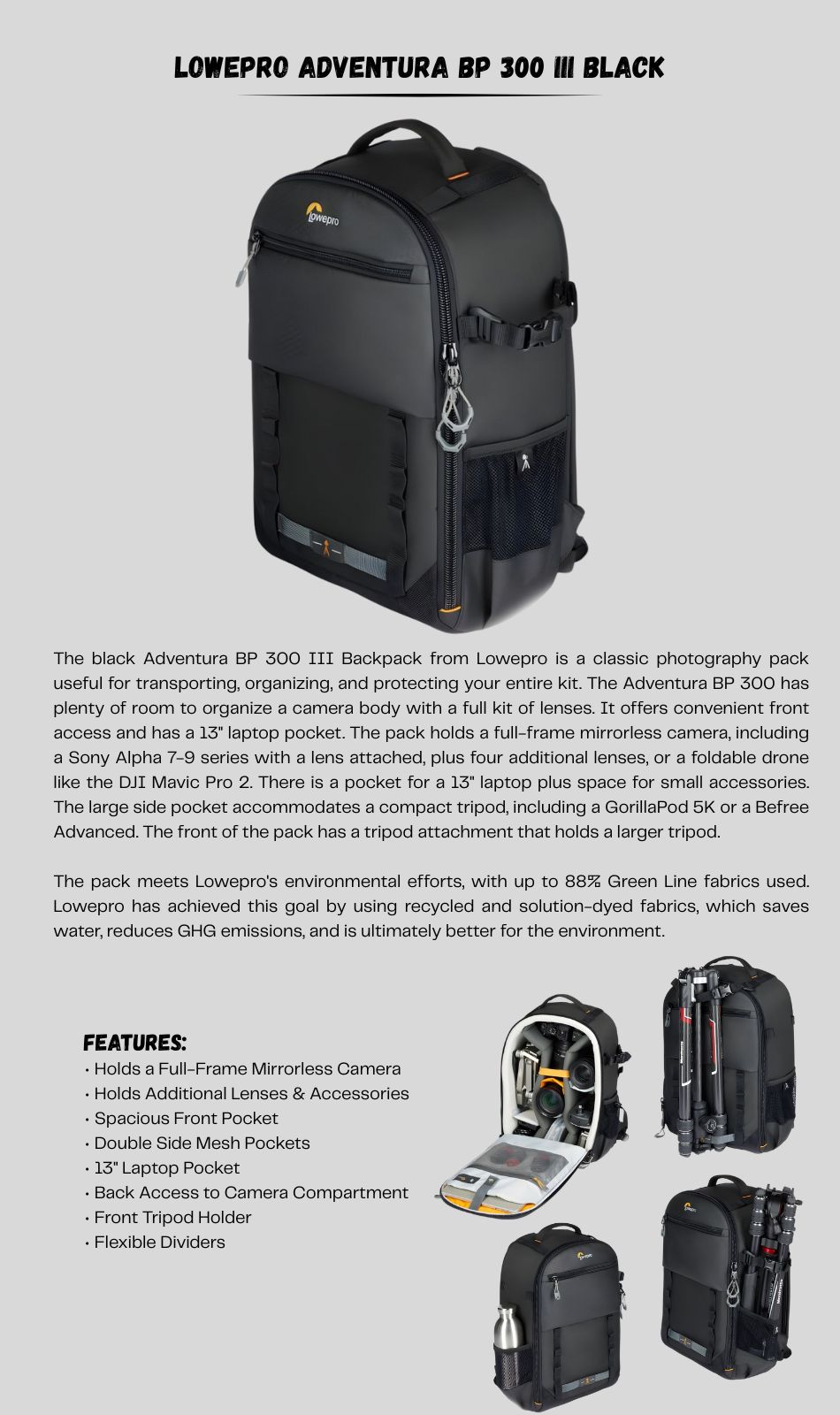 • The black Adventura BP 300 III Backpack from Lowepro is a classic photography pack useful for transporting, organizing, and protecting your entire kit. The Adventura BP 300 has plenty of room to organize a camera body with a full kit of lenses. It offers convenient front access and has a 13'' laptop pocket. The pack holds a full-frame mirrorless camera, including a Sony Alpha 7-9 series with a lens attached, plus four additional lenses, or a foldable drone like the DJI Mavic Pro 2. There is a pocket for a 13" laptop plus space for small accessories. The large side pocket accommodates a compact tripod, including a GorillaPod 5K or a Befree Advanced. The front of the pack has a tripod attachment that holds a larger tripod.