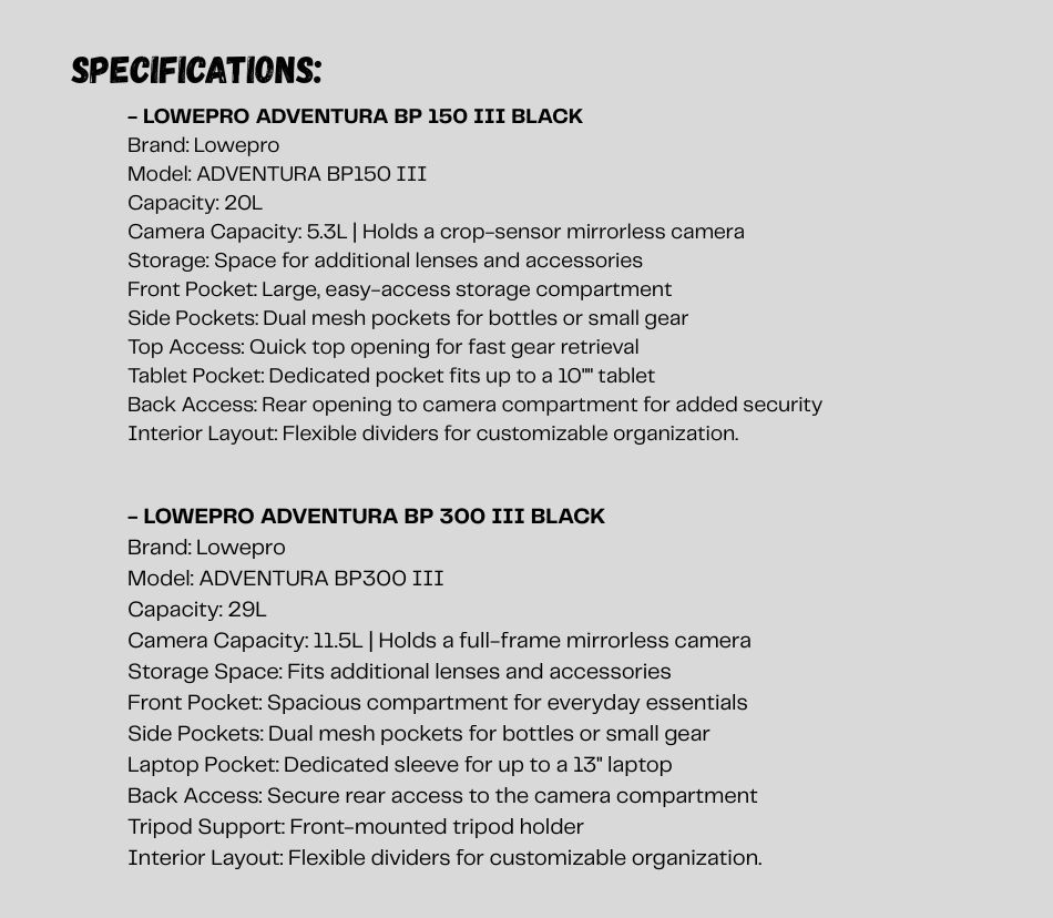 • The black Adventura BP 150 III Backpack from Lowepro is a classic photography pack useful for transporting, organizing, and protecting your entire kit. The Adventura BP 150 has a roomy, top-loading compartment for personal items and a padded 10'' tablet pocket. It offers rear access to the camera compartment with flexible dividers to organize your gear. The pack holds a crop-sensor mirrorless camera and lens, including a Fujifilm XT200, a Canon M50 MII, an EOS R10, or a Nikon Z50 with a lens attached. It will also hold three small lenses, or a battery and a charger, or a foldable drone including the DJI Mavic Air. There is a pocket for a 10" tablet and space for additional gear including a jacket, sunglasses, a water bottle, and more. A large exterior side pocket accommodates a compact tripod including a GorillaPod 3K or a Befree Advanced.