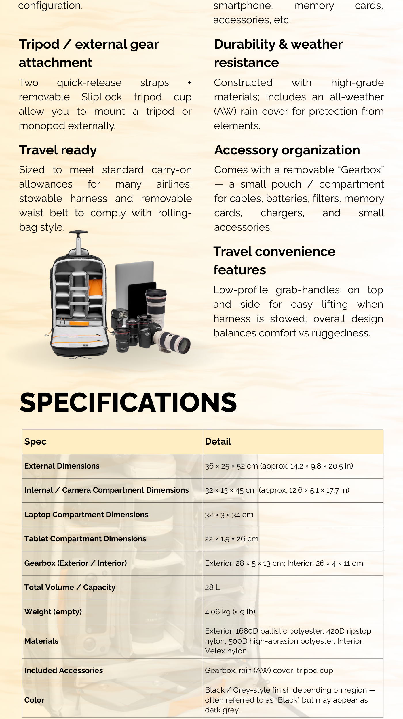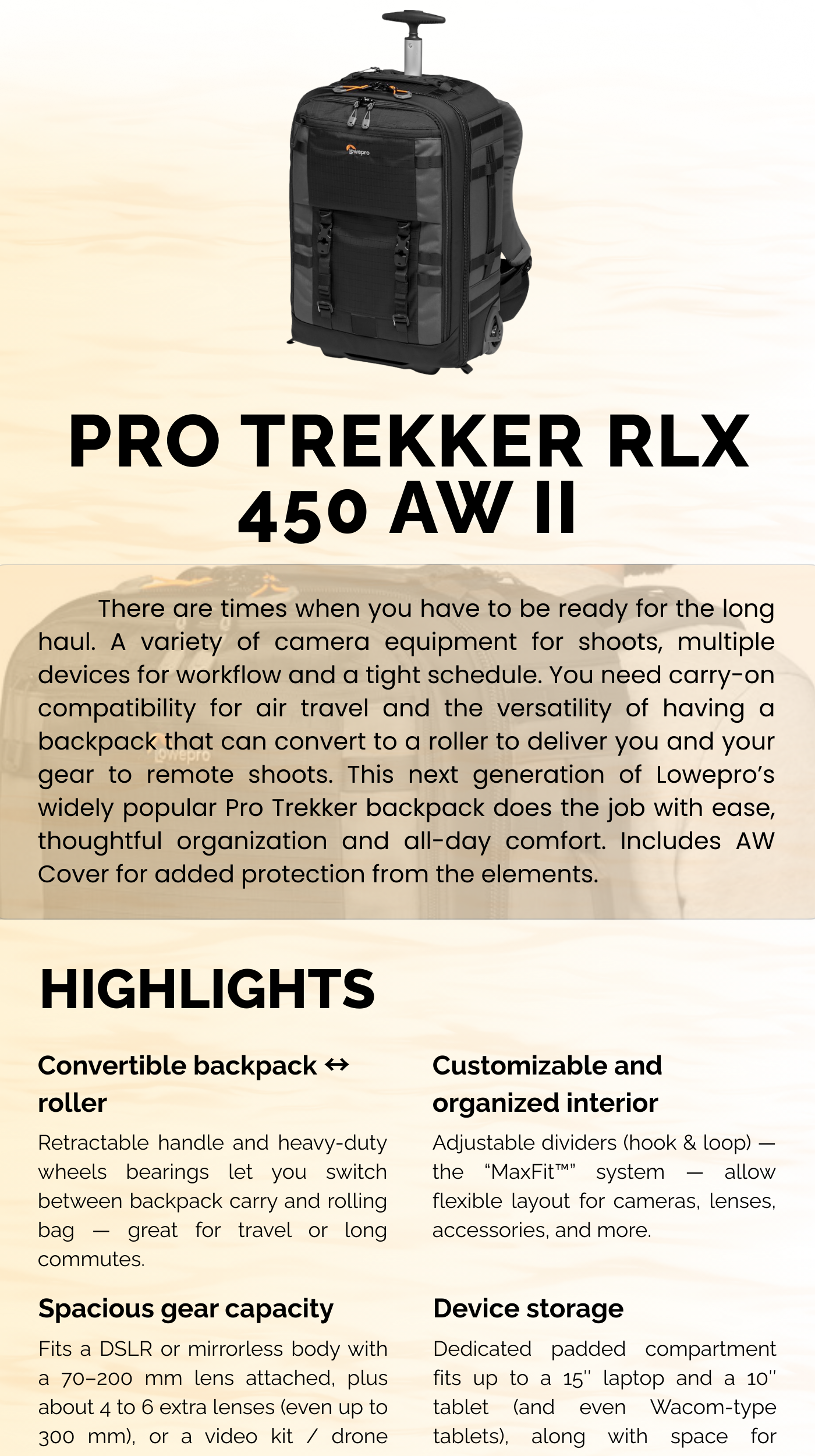 Lowepro Pro Trekker RLX 450 AW II Camera Backpack Convertible to Roller Bag