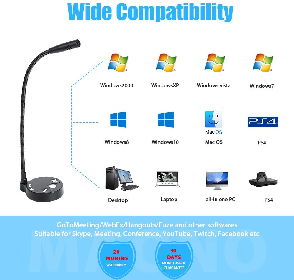Plug & Play, no drivers to install. Simply plug a microphone into any available USB port, select and default it as your input device in software settings. Perfect compatible with Windows (7, 8, 10, 2000 and XP), Mac OS, PS4, Desktop, Laptop, and All-in-one PC. Suitable for Skype, Meeting, Conference, YouTube, Twitch, Facebook, etc.