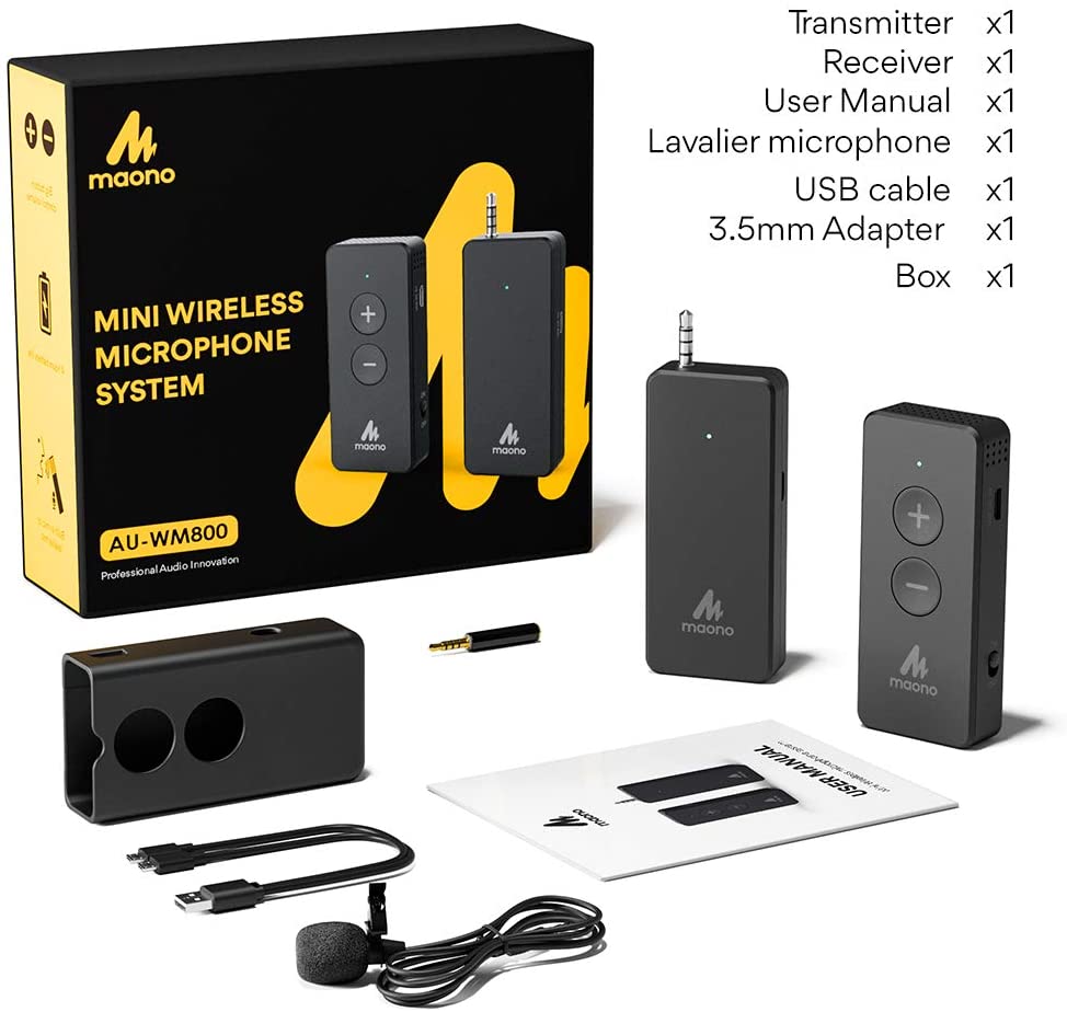 Maono AU-WM800 WM800 Plug and Play Mini Wireless Lavalier Microphone System with Stable Transmission Ultra Lightweight External Lapel Microphone with Volume Adjustment for Vlogging, Video Recording, Interviews