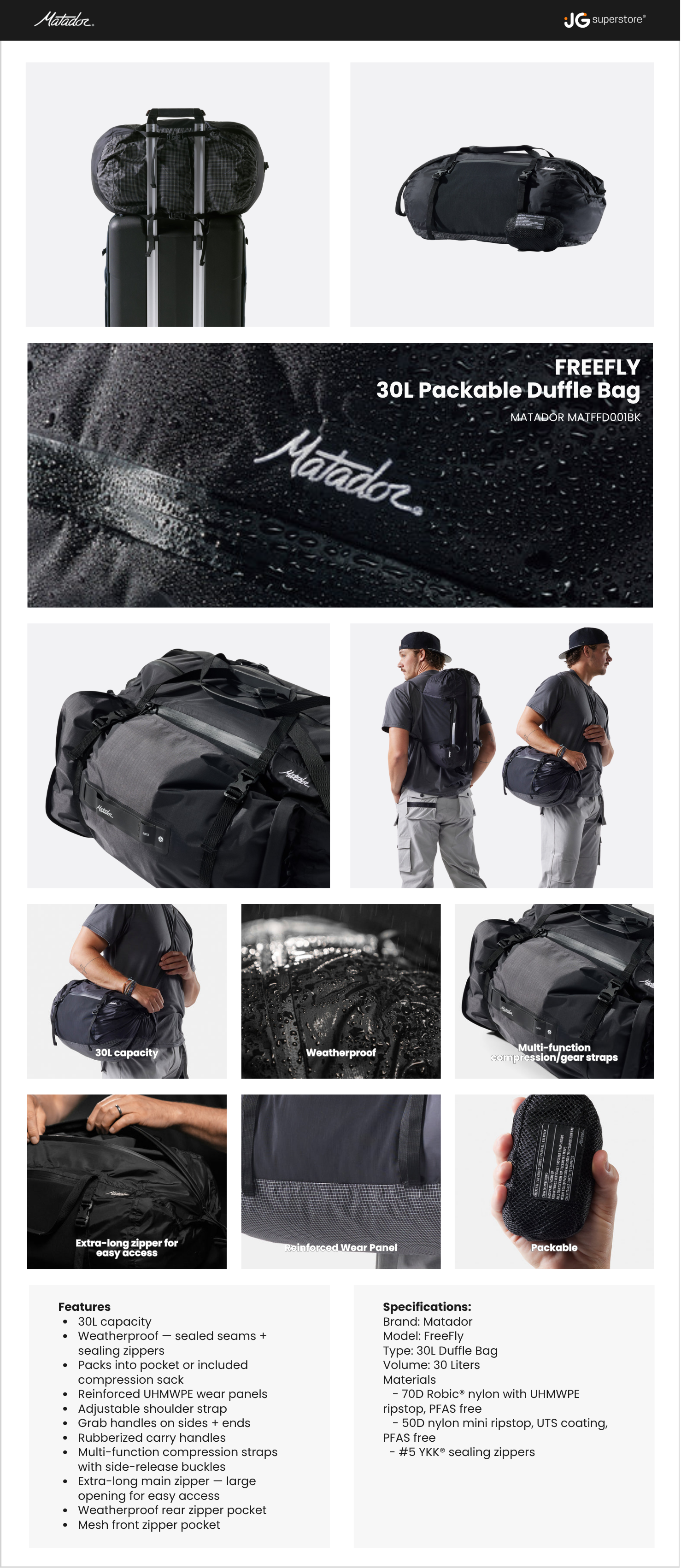 The Freefly Packable Duffle provides 30 liters of weatherproof space when you need it, and packs down small when you don’t.