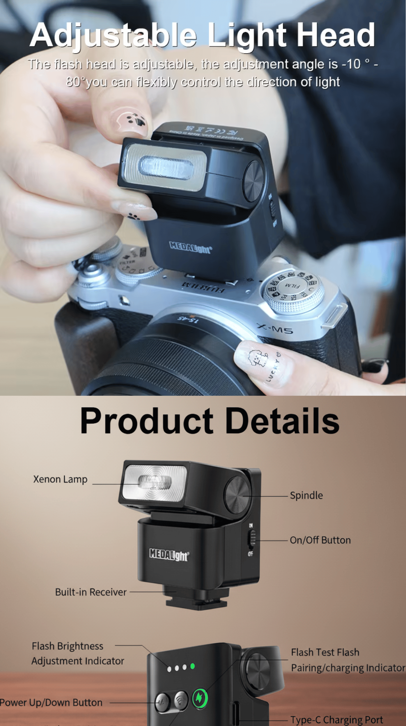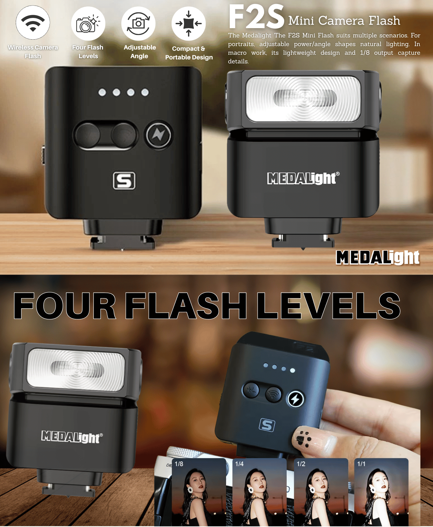 The Medalight The F2S Mini Flash suits multiple scenarios. For portraits, adjustable power/angle shapes natural lighting. In macro work, its lightweight design and 1/8 output capture details. For events, fast recycling and angle flexibility avoid missing moments. Ideal for travel too—compact, easy - to - charge, ready for diverse lighting.