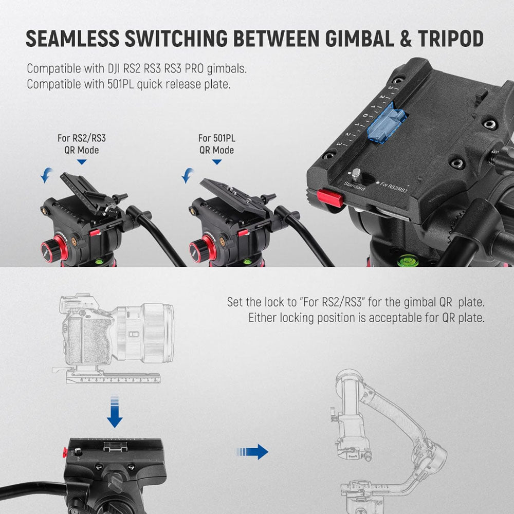 - Quick and Easy Modes Switching- The fluid head has two QR modes, compatible with DJI RS2 RS3 RS3 PRO gimbal. Compared to the traditional slide in structure, you can press the quick release plate directly from the top of the fluid head and lock it in 1s, as well as quickly release the plate via the side release button, more efficient and convenient to switch between tripod and gimbal shooting