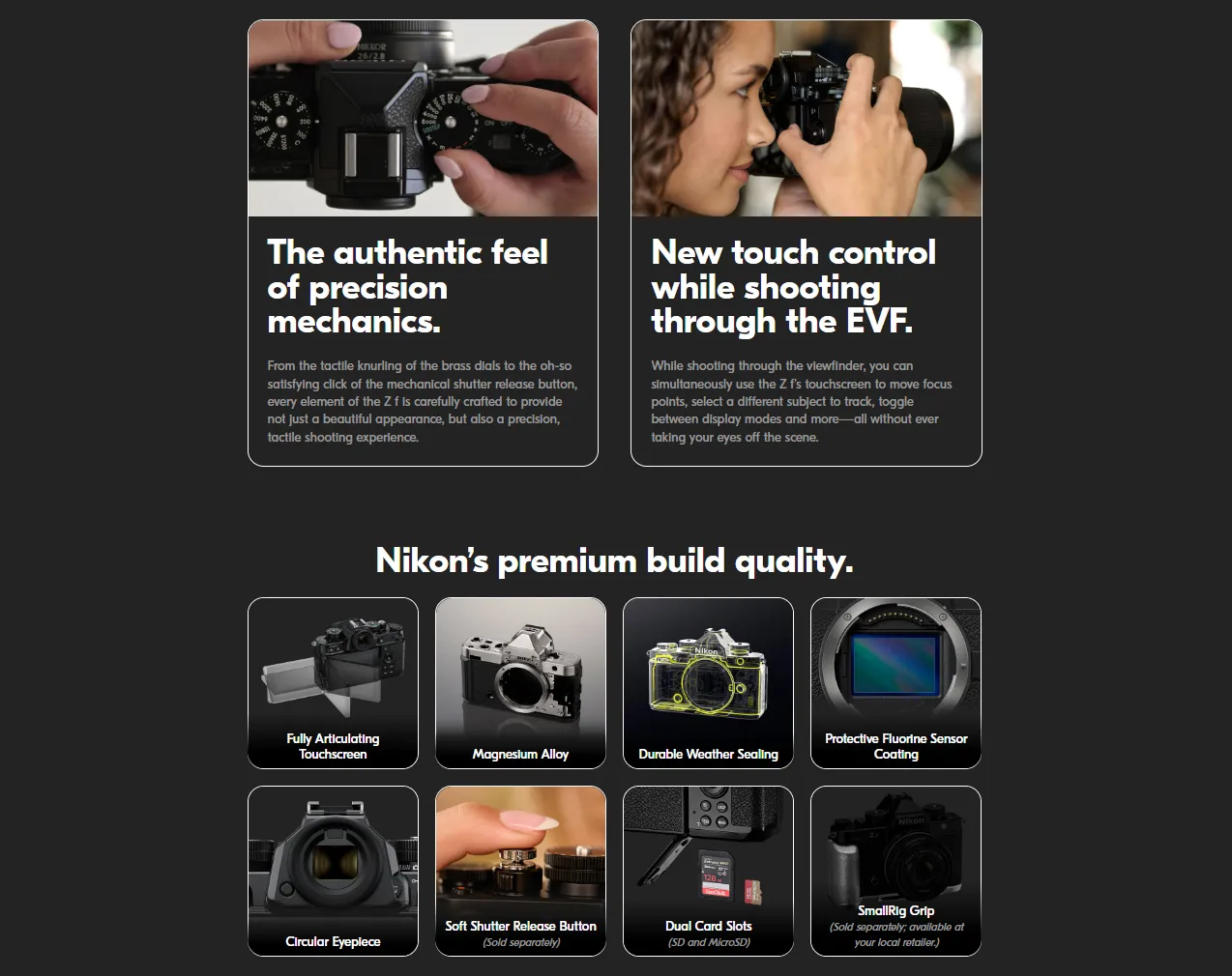Zf Mirrorless Camera proves once again that good style never goes away. While the camera's body design retrieves the filmic, steel-feel functionalism of vintage SLRs, its insides are nonetheless outfitted with the latest in Z-series features and capabilities, turning the Zf's iconic silhouette into a modern and tactile shooter that uses its advanced tech to deliver timeless imagery.