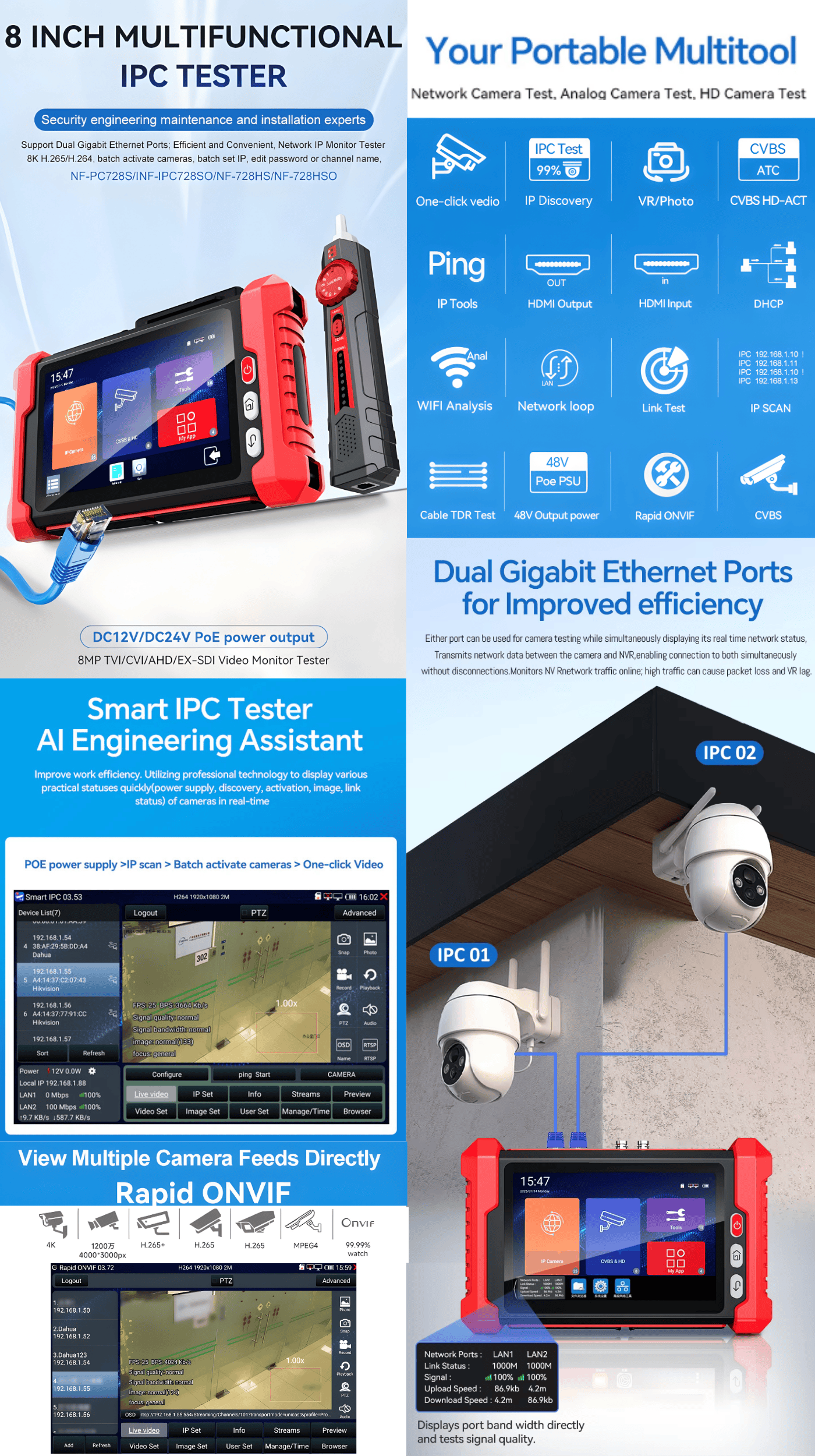 This IPC tester combines a 7-inch touch screen with button controls to offer real-time CCTV monitoring, IP camera testing, and configuration. It supports 4K H.265, ONVIF, CVBS, TVI, CVI, and AHD protocols, enabling checks on IP address, PING, speed, and more. Users can adjust camera settings, run playback, and perform zoom, record, and snapshot functions. With PoE support, 5V/12V/24V DC power outputs, and various ports including RJ45, CVBS, SDI, HDMI, and fiber optic, it also enables cable tests like continuity and TDR, making it a versatile tool for surveillance setup and diagnostics.